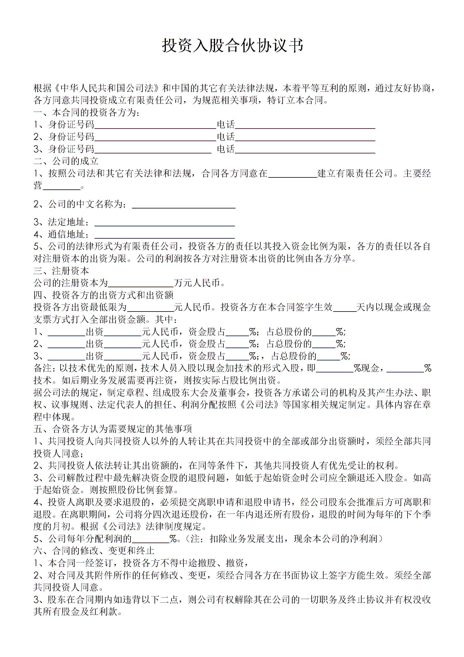 投资合伙协议(标准版)
