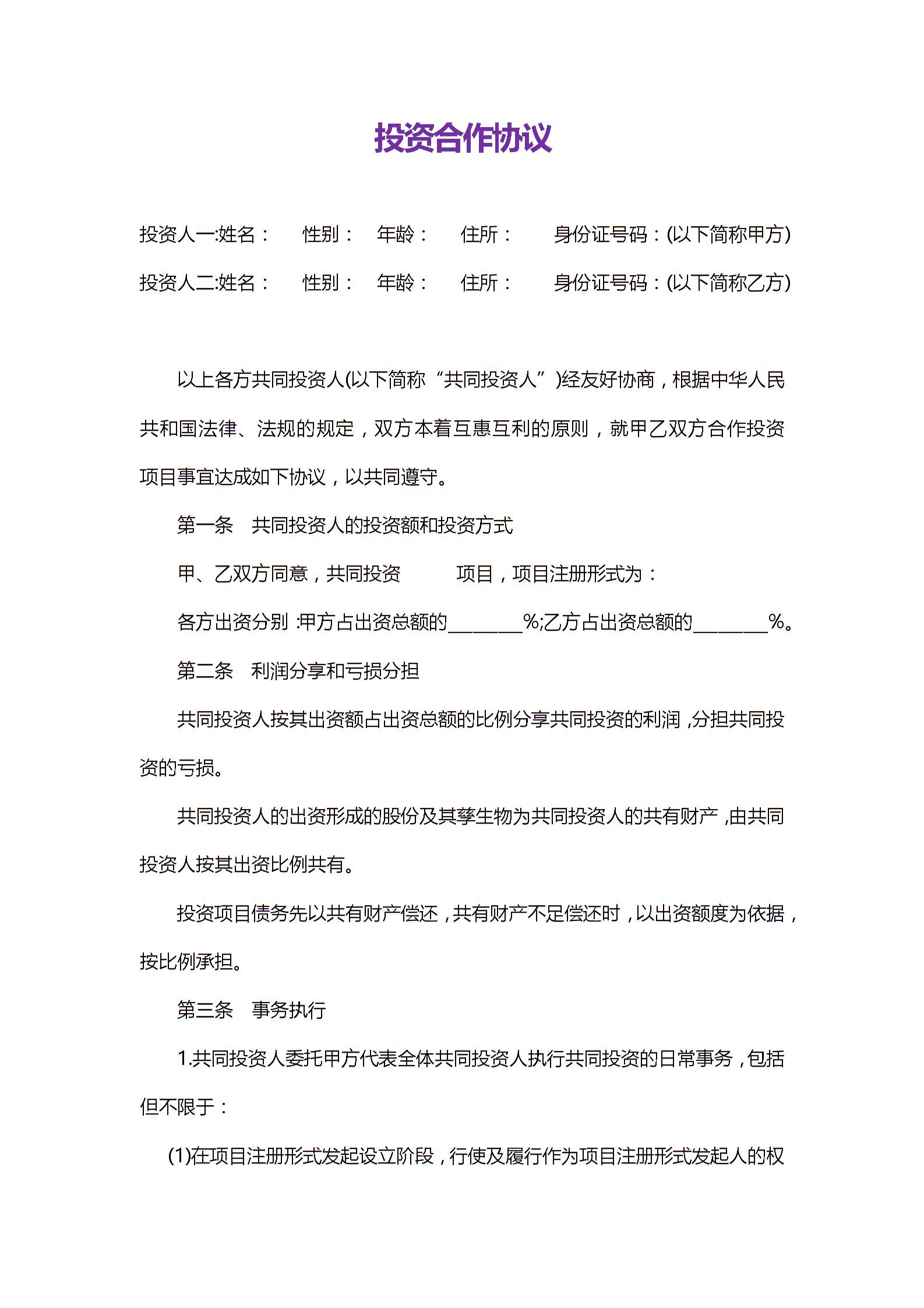 简单房地产投资合作协议书