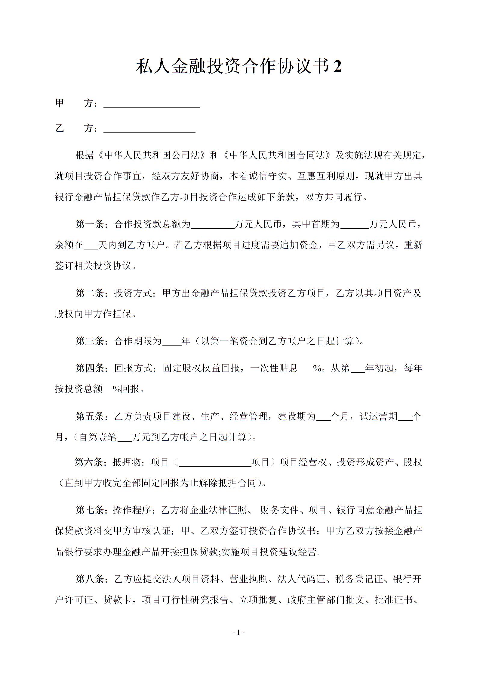 私人金融投资合作协议书2
