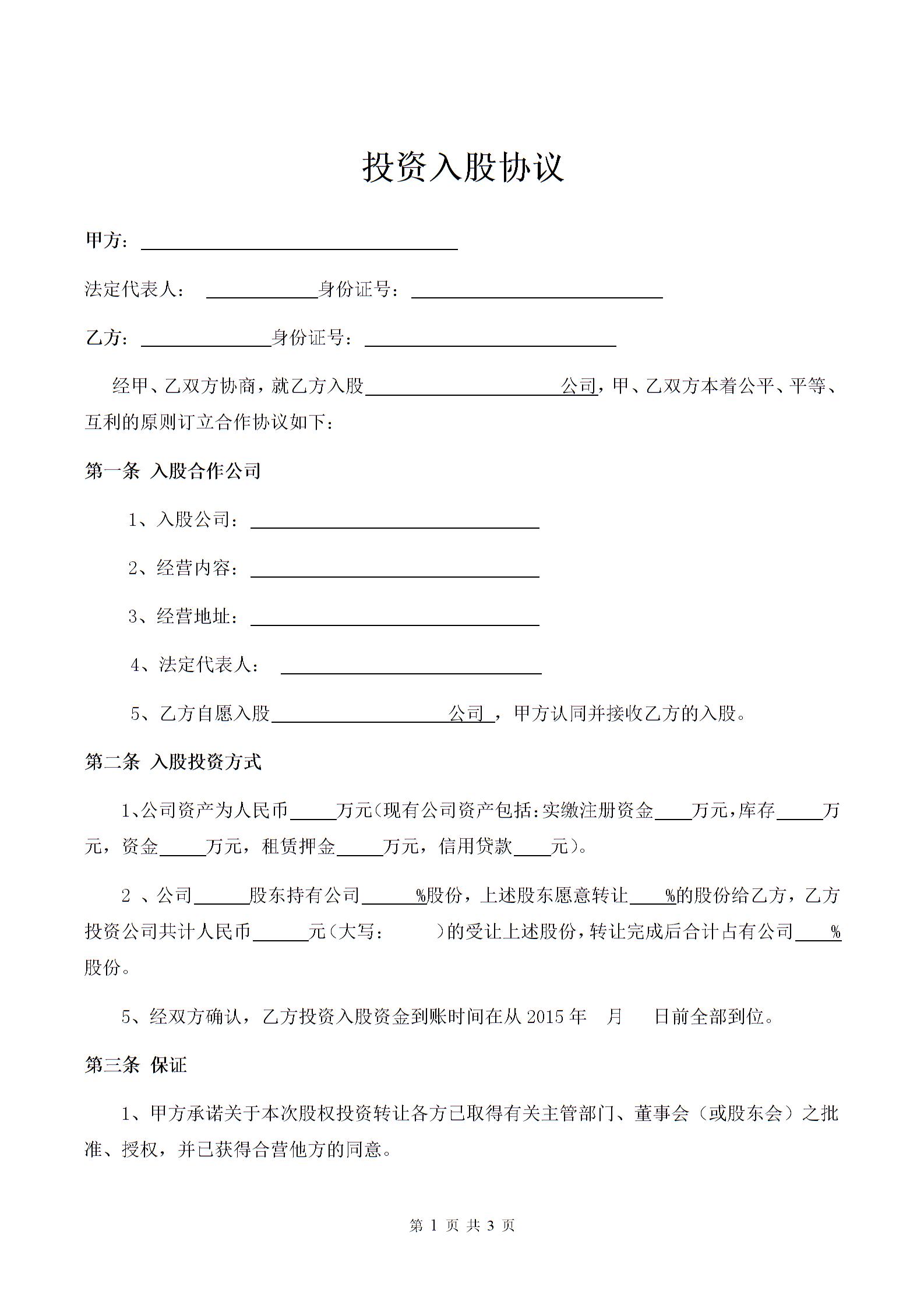 旅游公司投资入股协议律师拟定版本