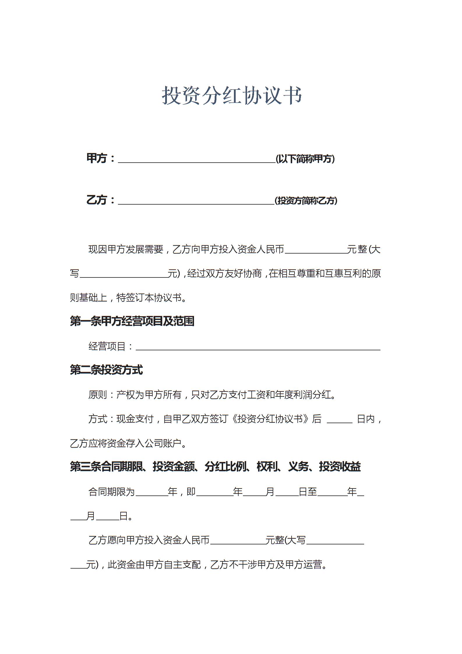 投资分红协议书示范文本