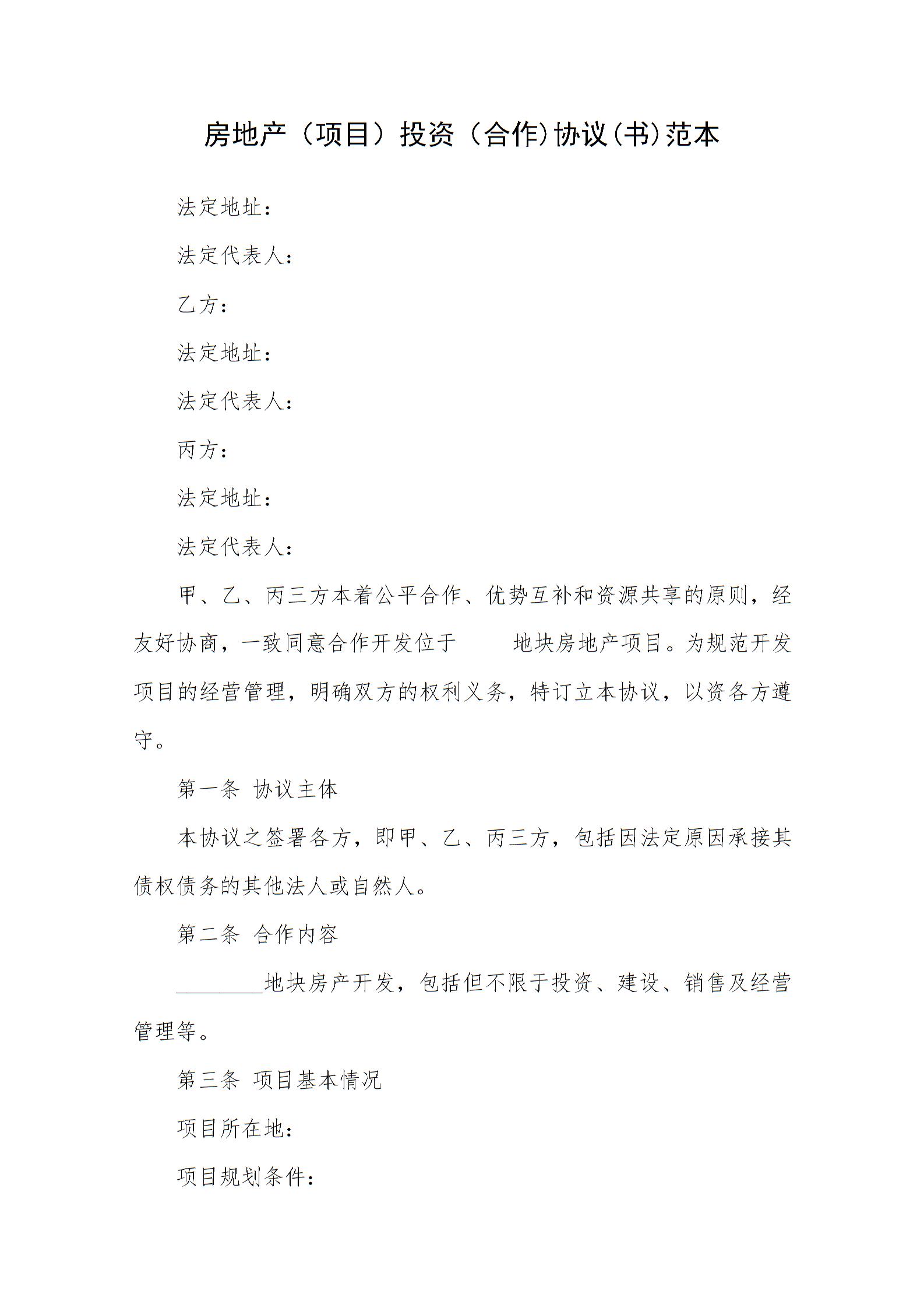 房地产项目投资合作协议书范本
