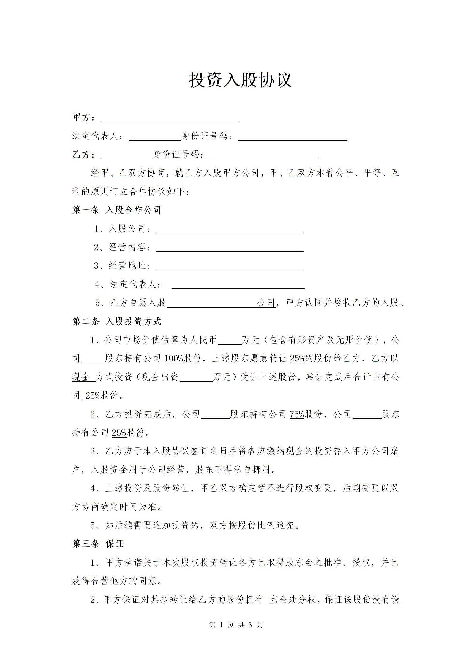 投资入股协议(公司)律师拟定版本1