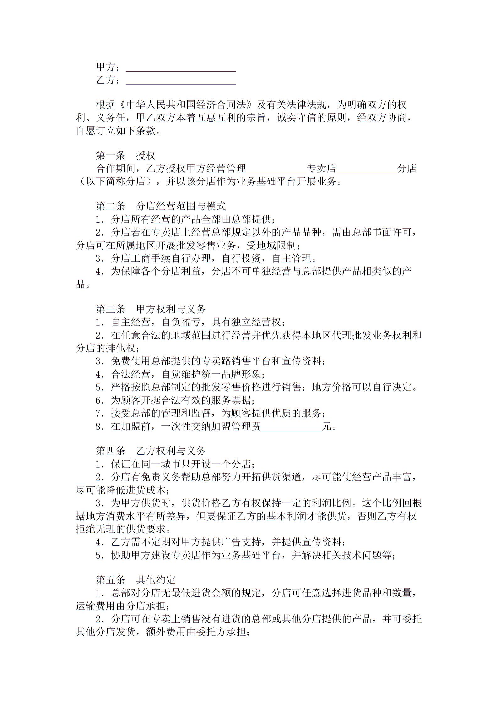 专卖店加盟合同