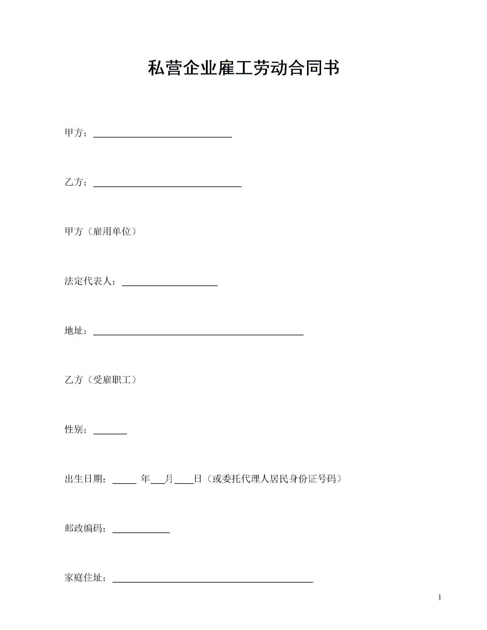 私营企业雇工劳动合同书