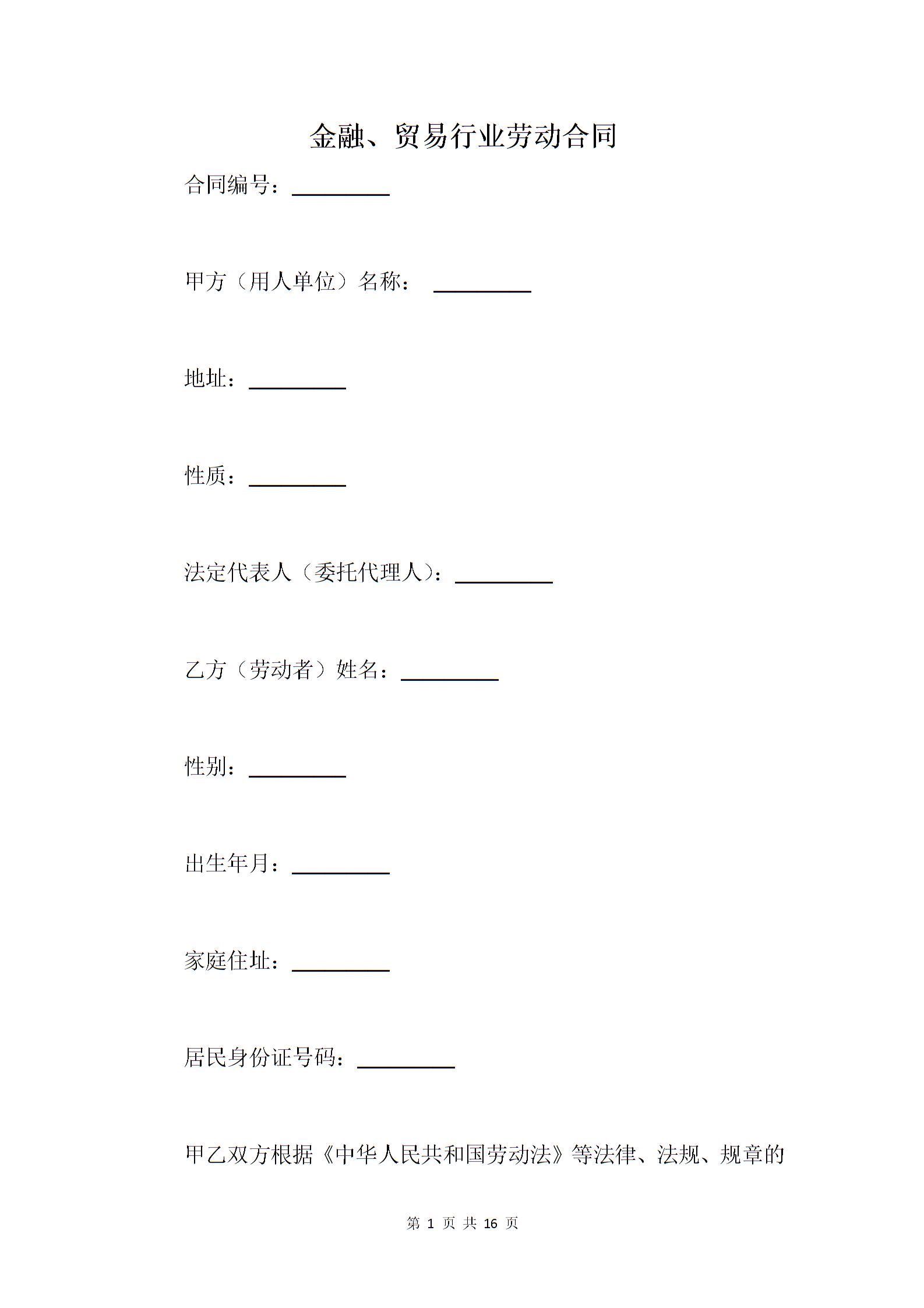 金融、贸易行业劳动合同