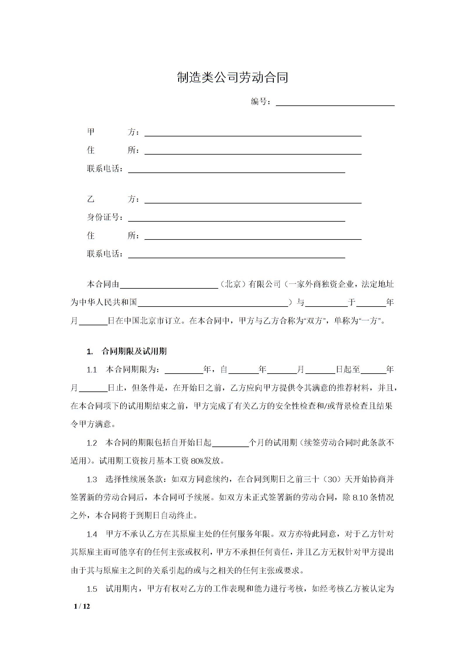 制造类公司劳动合同