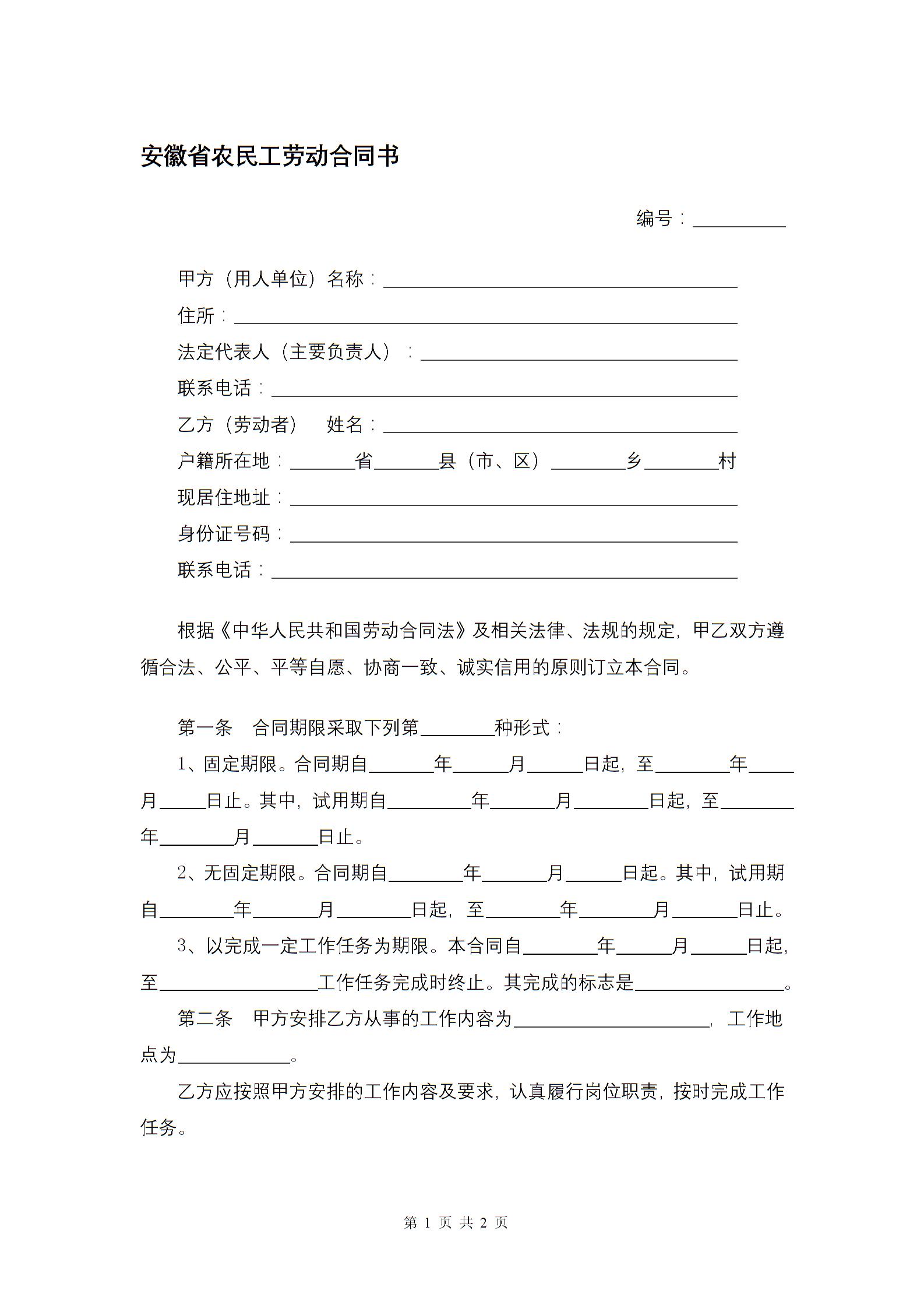 安徽省农民工劳动合同书
