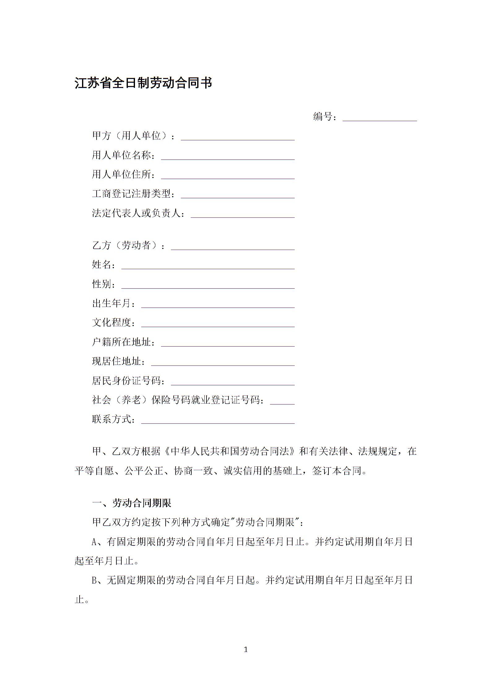 江苏省全日制劳动合同书