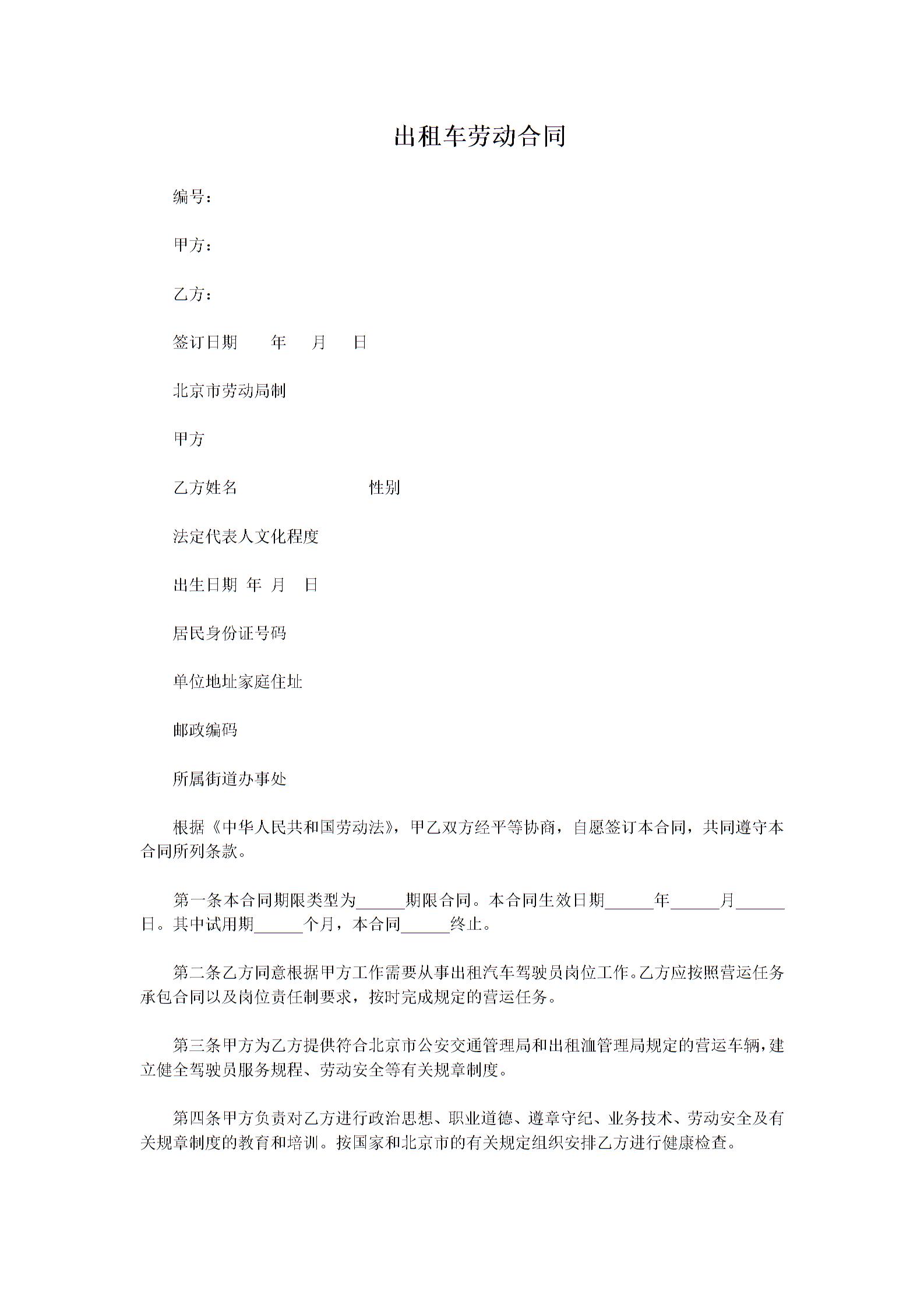 劳动合同书(适用出租汽车驾驶员)