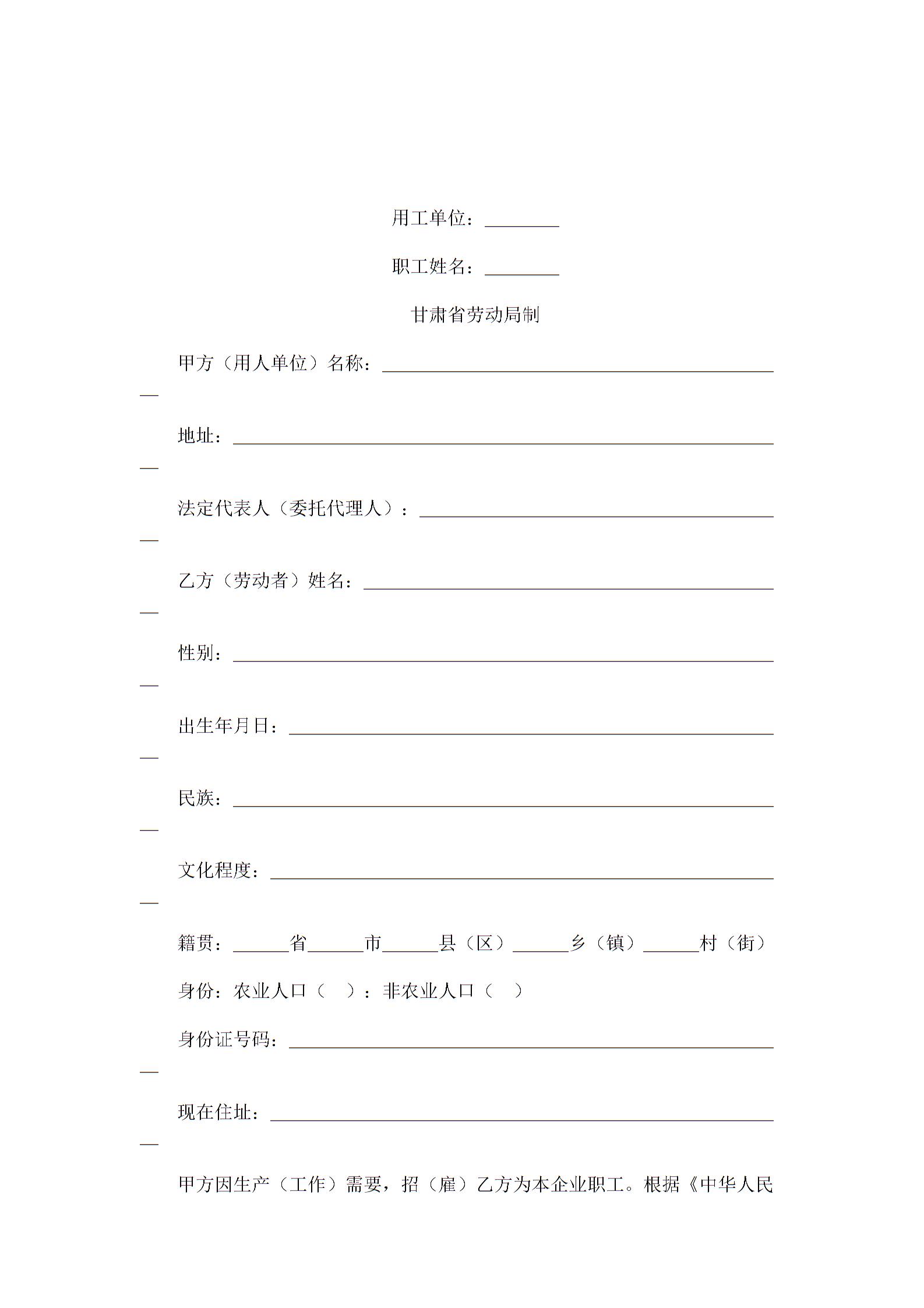 41【2017年最新合同模板】甘肃省劳动局私营企业职工劳动合同书