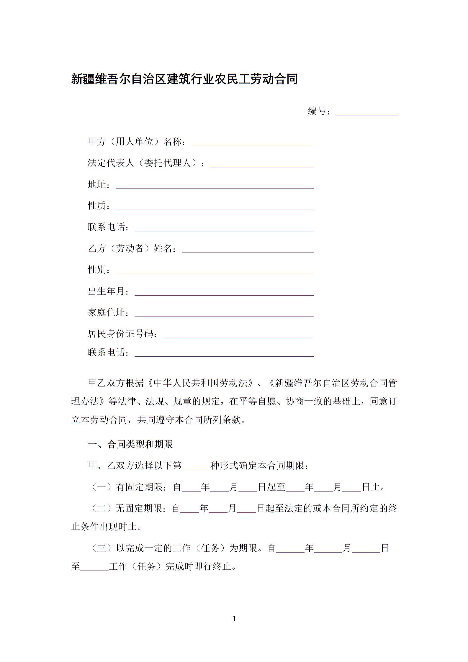 新疆维吾尔自治区建筑行业农民工劳动合同