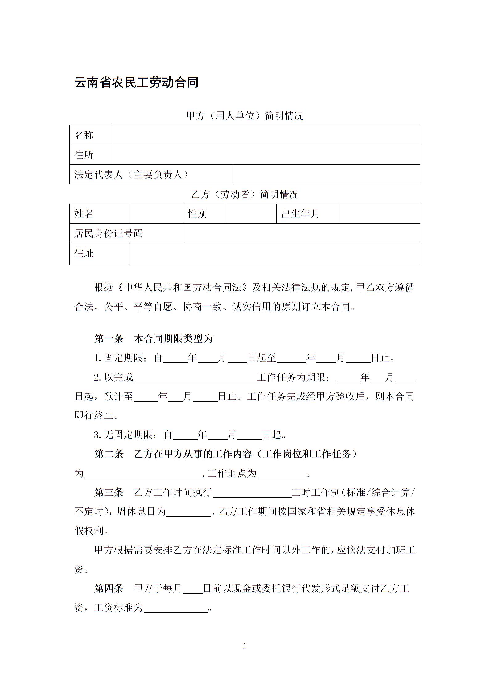 云南省农民工劳动合同