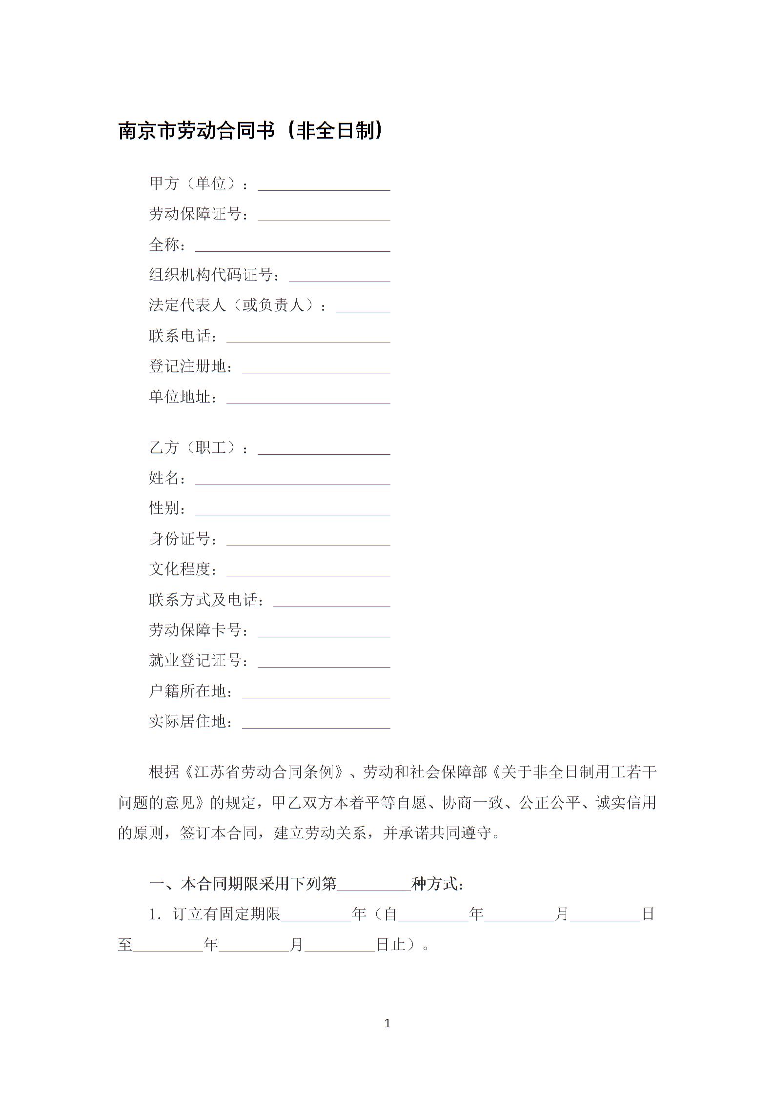 南京市劳动合同书(非全日制)