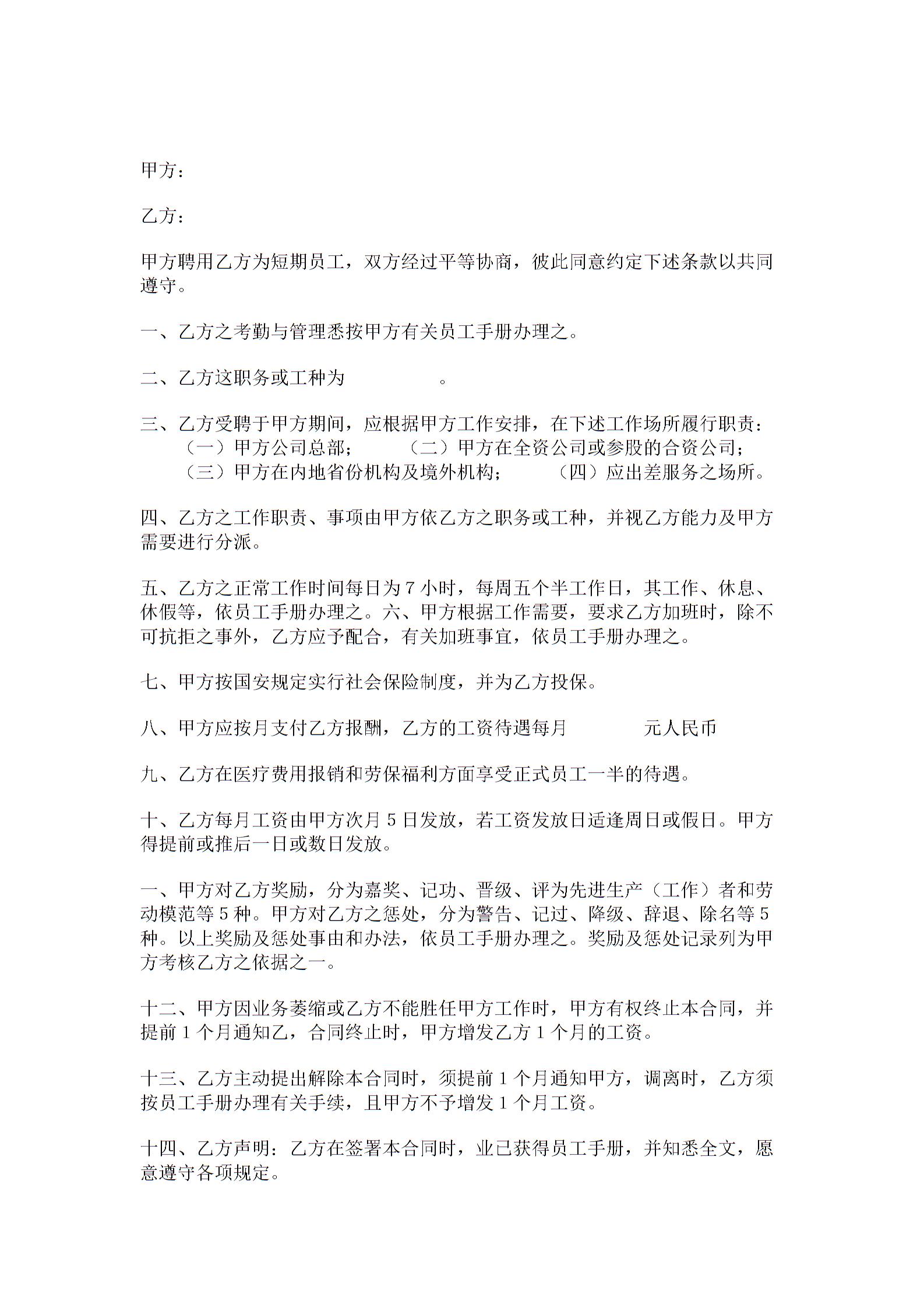 70【2017年最新合同模板】员工短期聘用合同