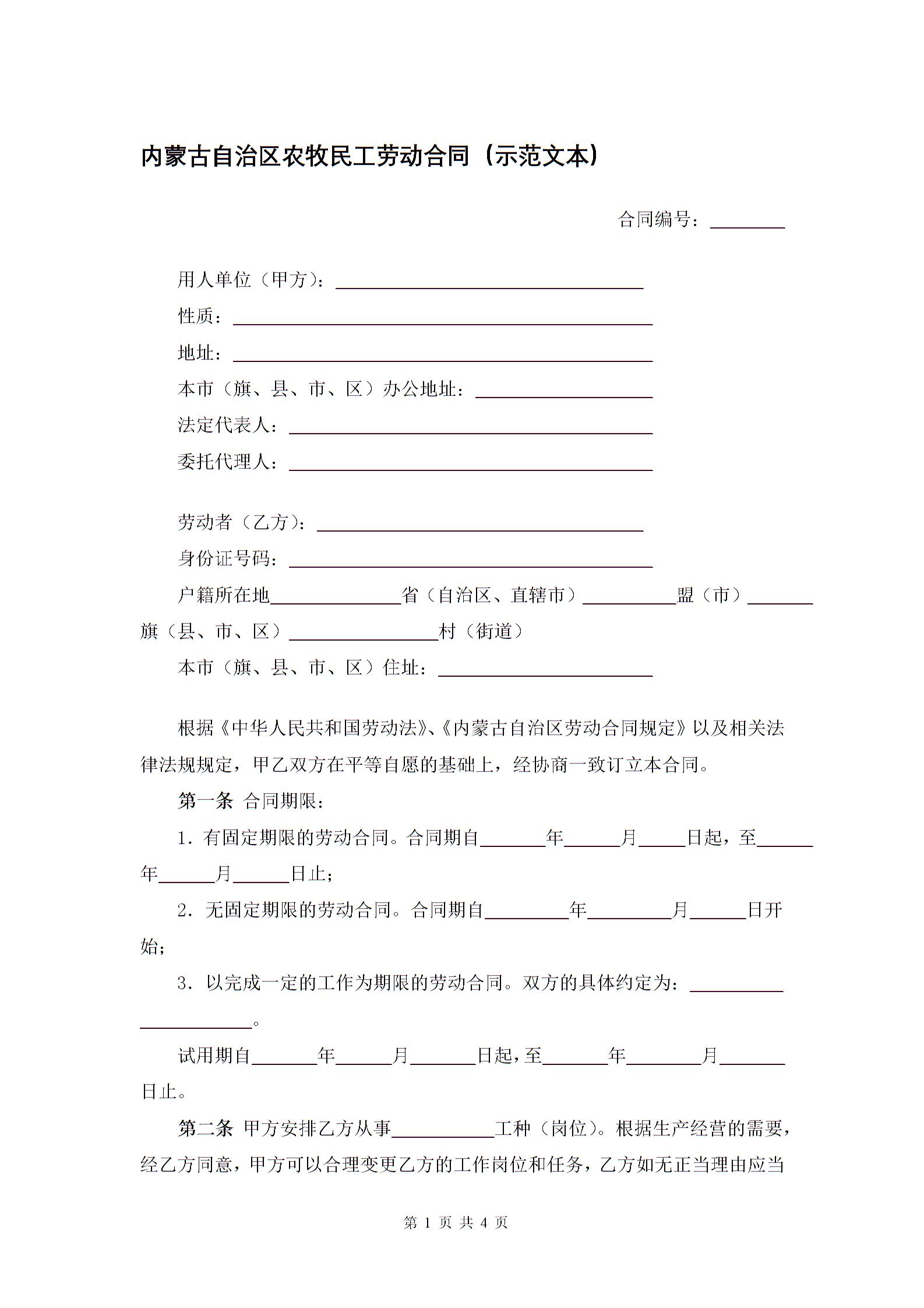 内蒙古自治区农牧民工劳动合同(示范文本)
