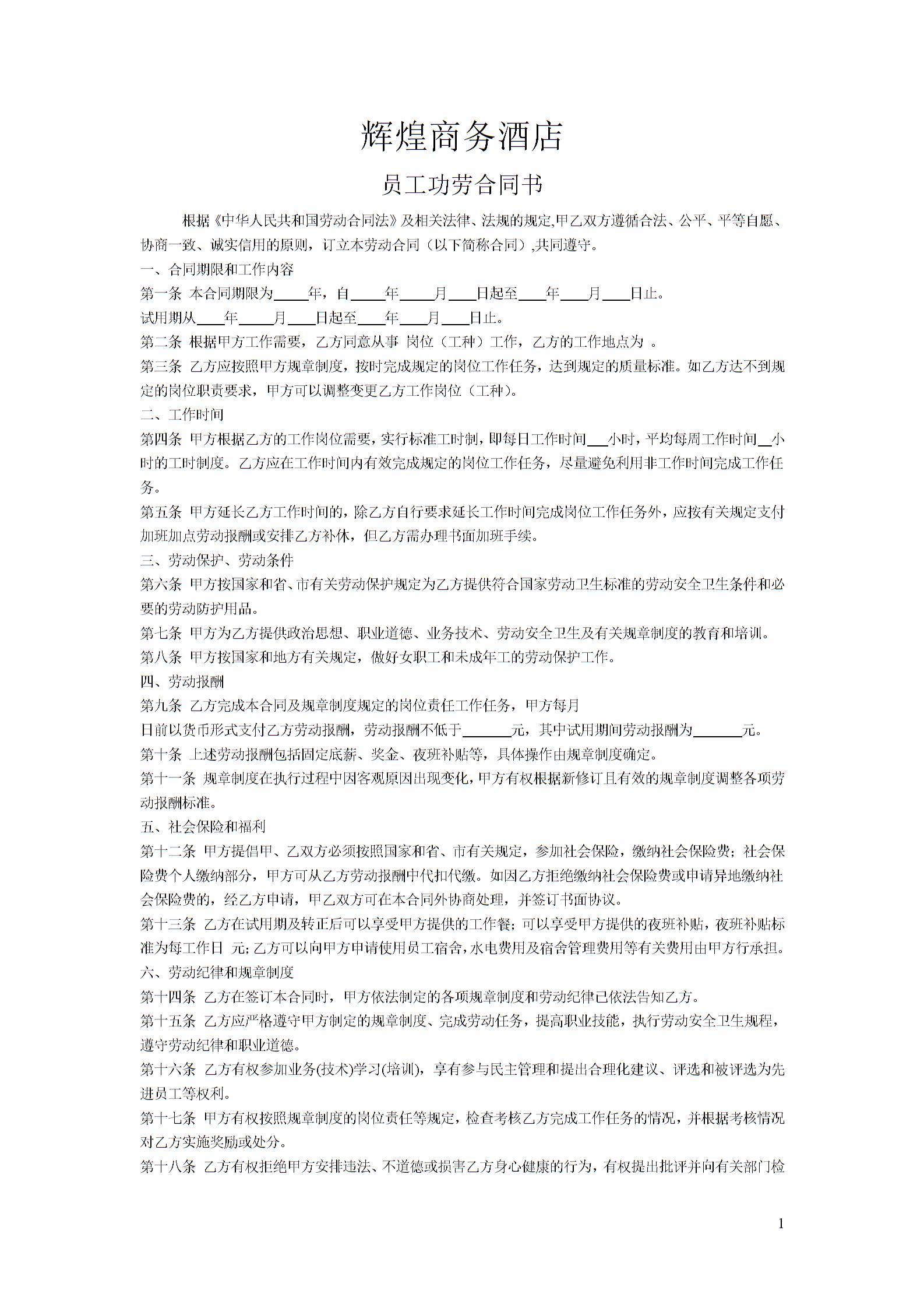酒店劳动合同1模板
