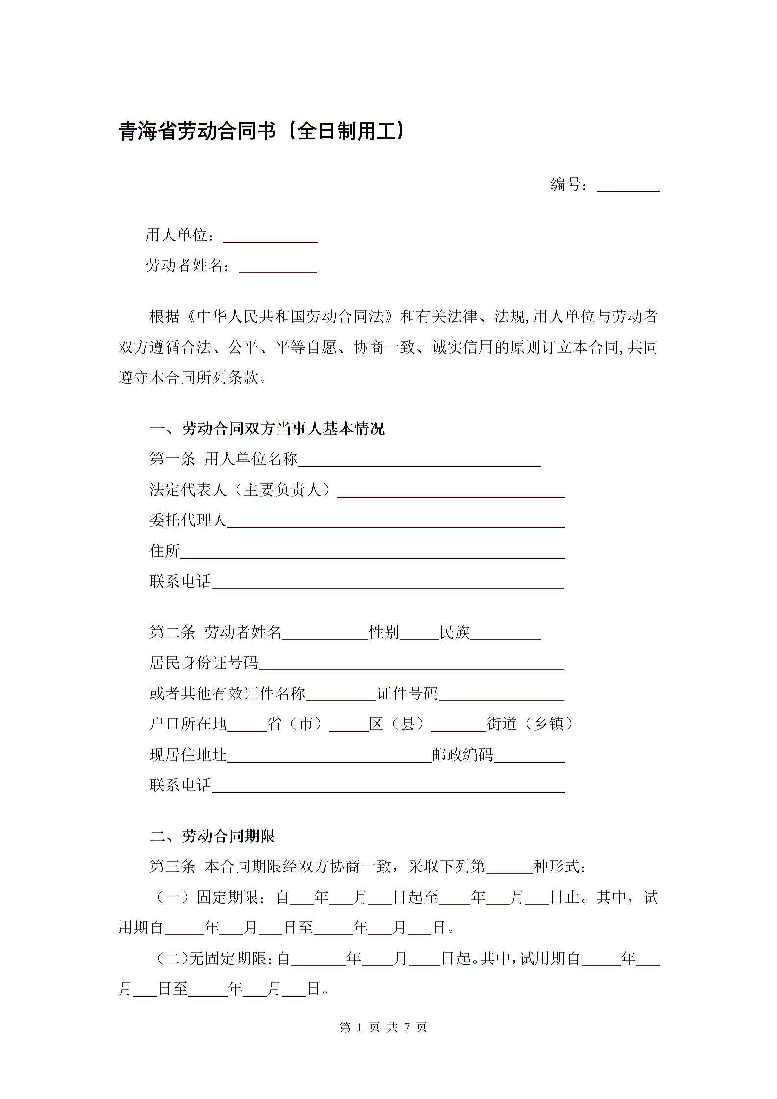 青海省劳动合同书(全日制用工)