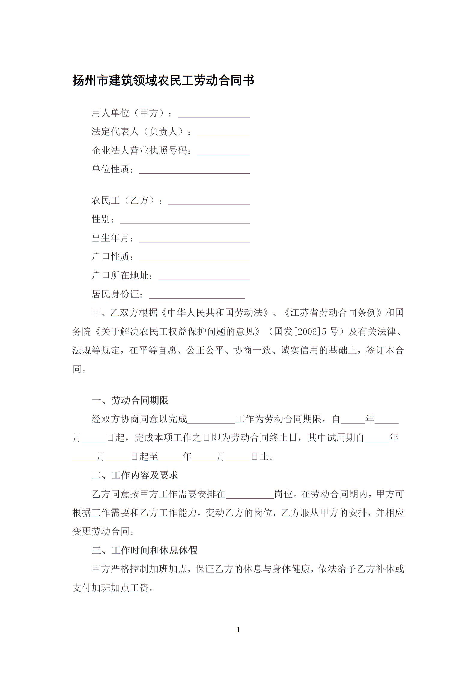 扬州市建筑领域农民工劳动合同书