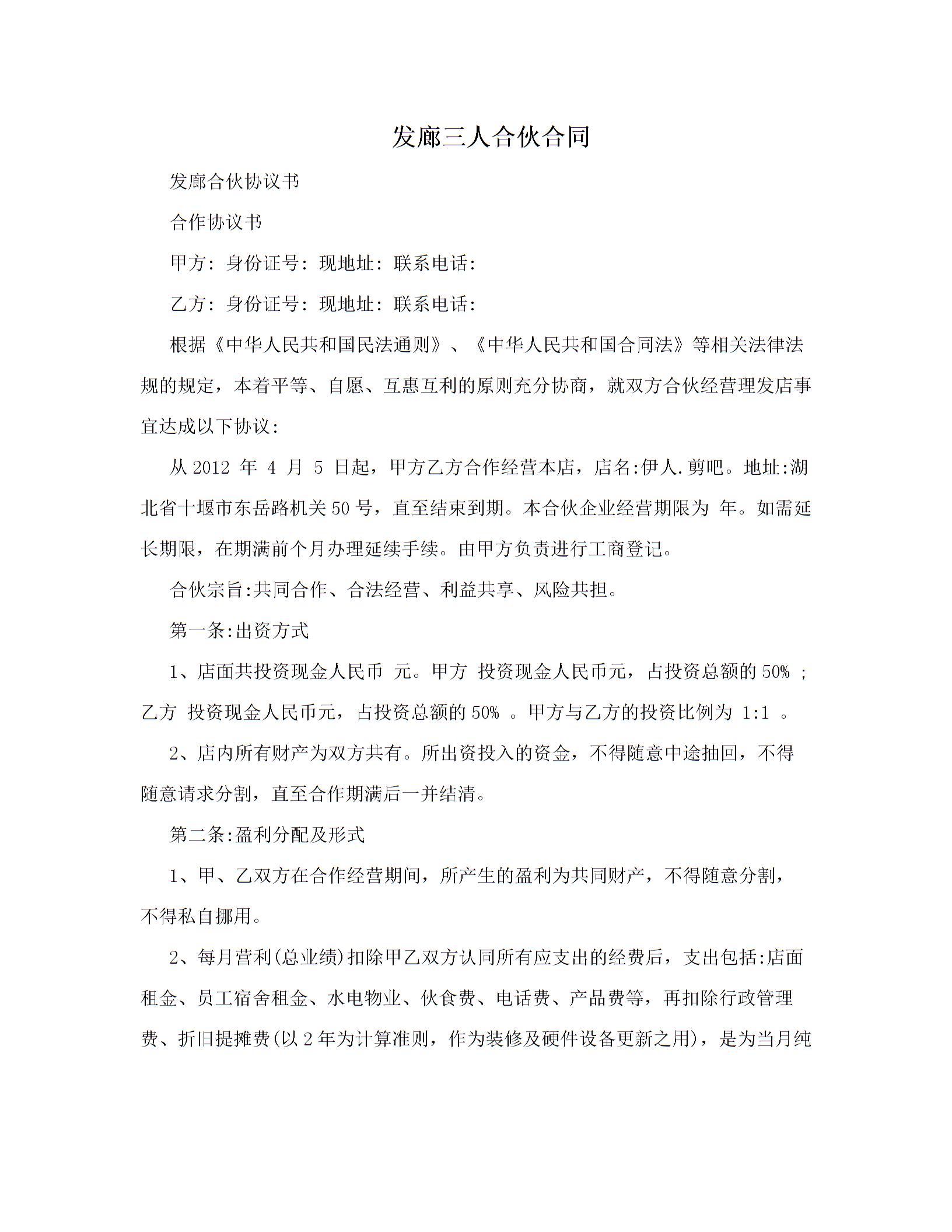 发廊三人合伙合同