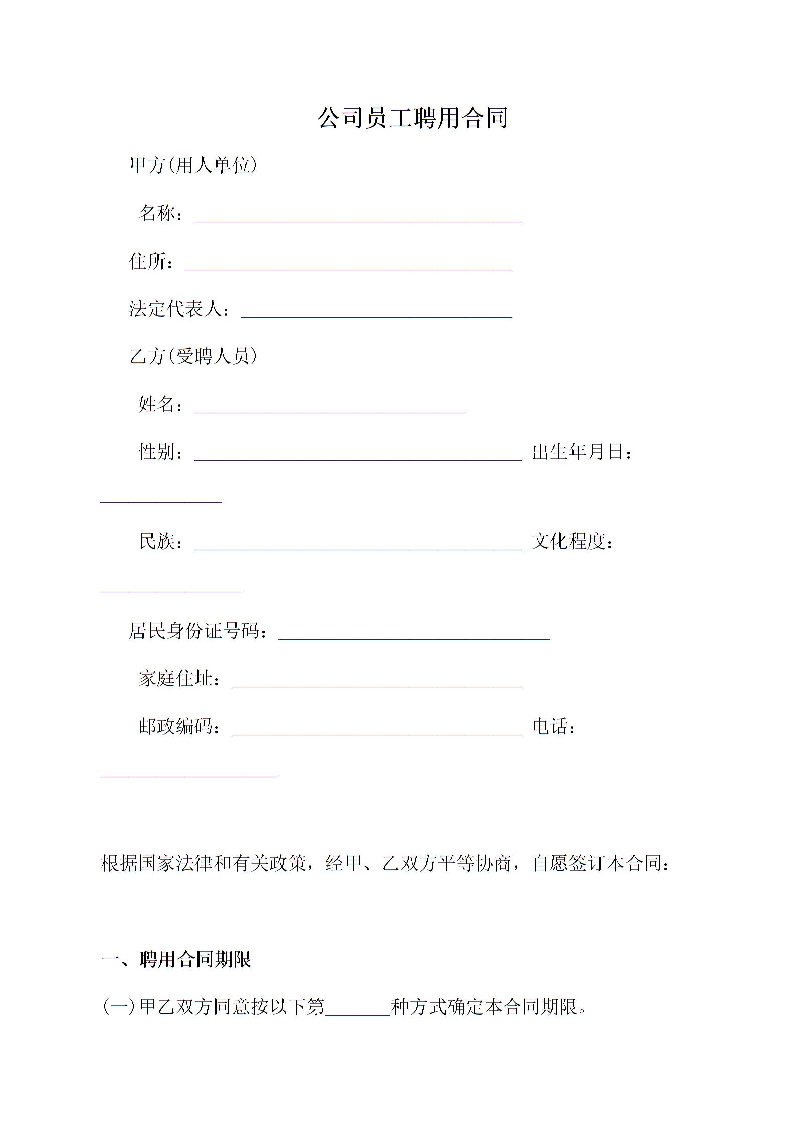 公司员工聘用合同