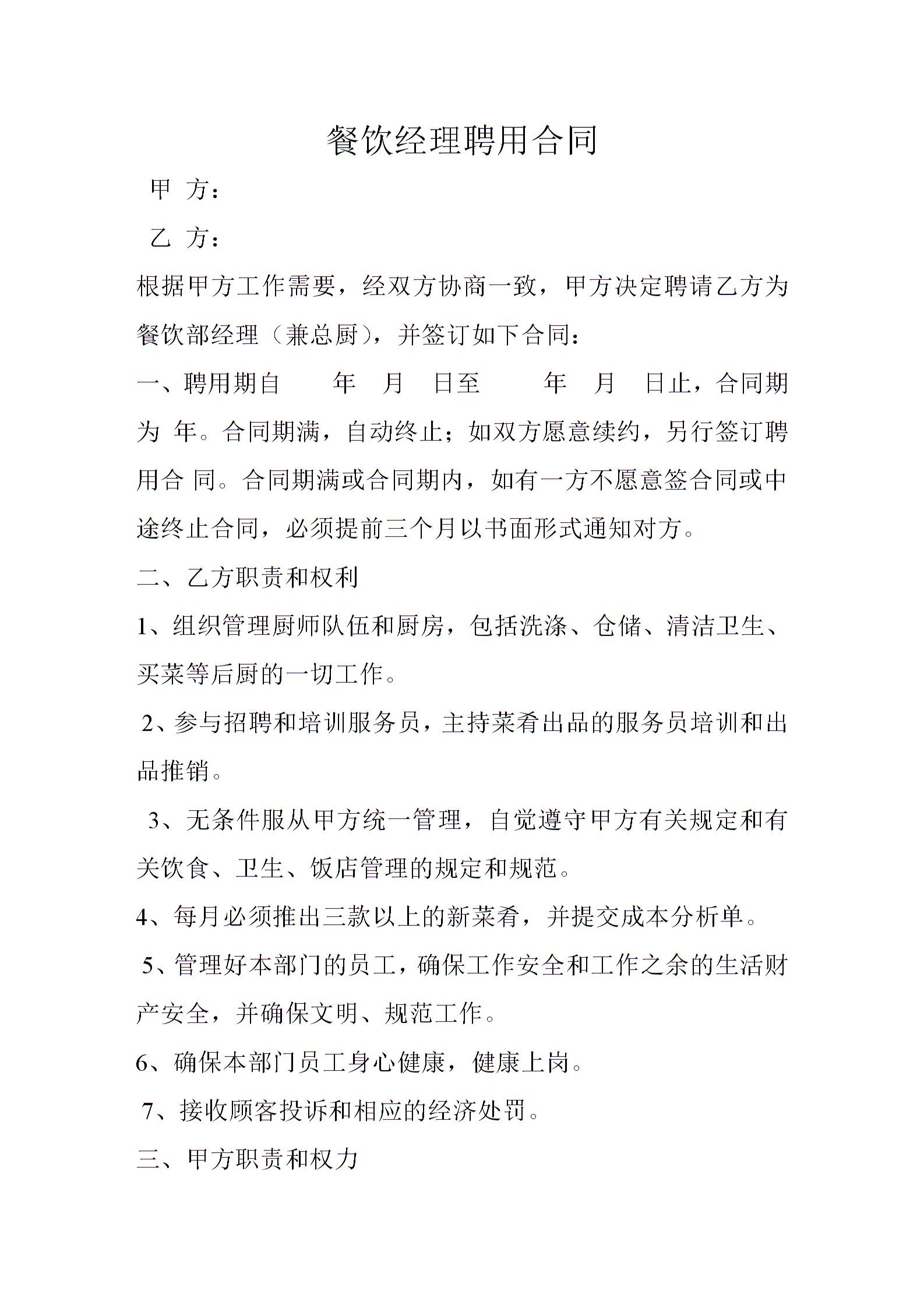 餐饮经理聘用合同