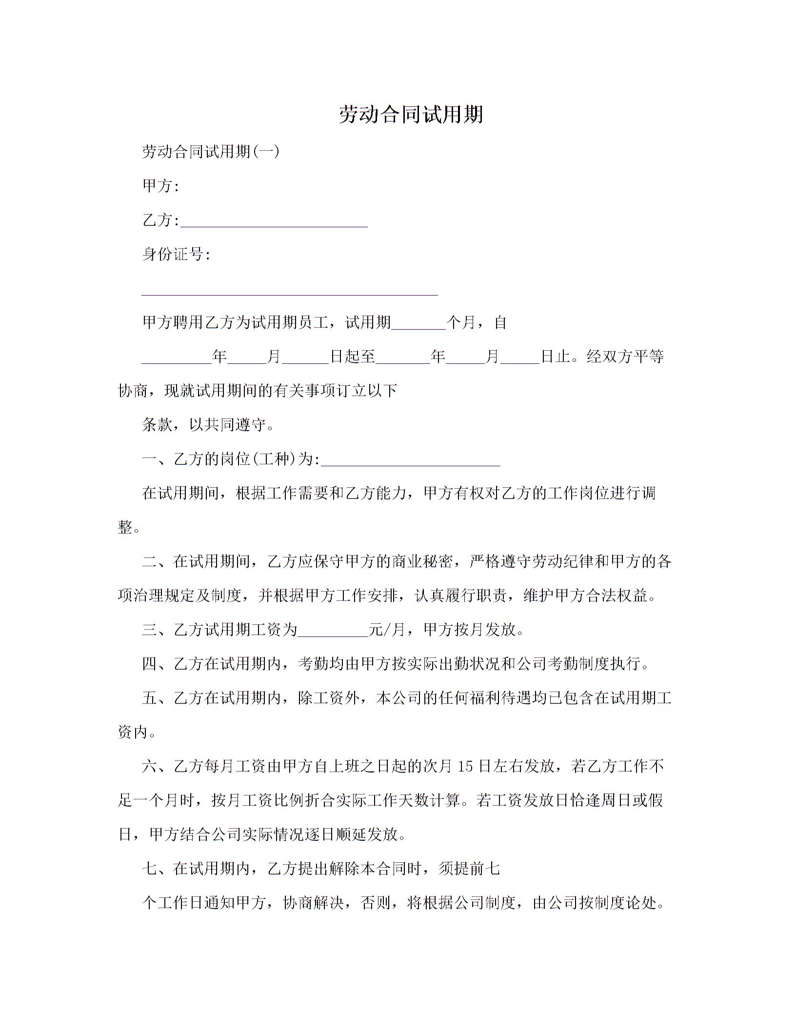 试用期劳动合同范本下载