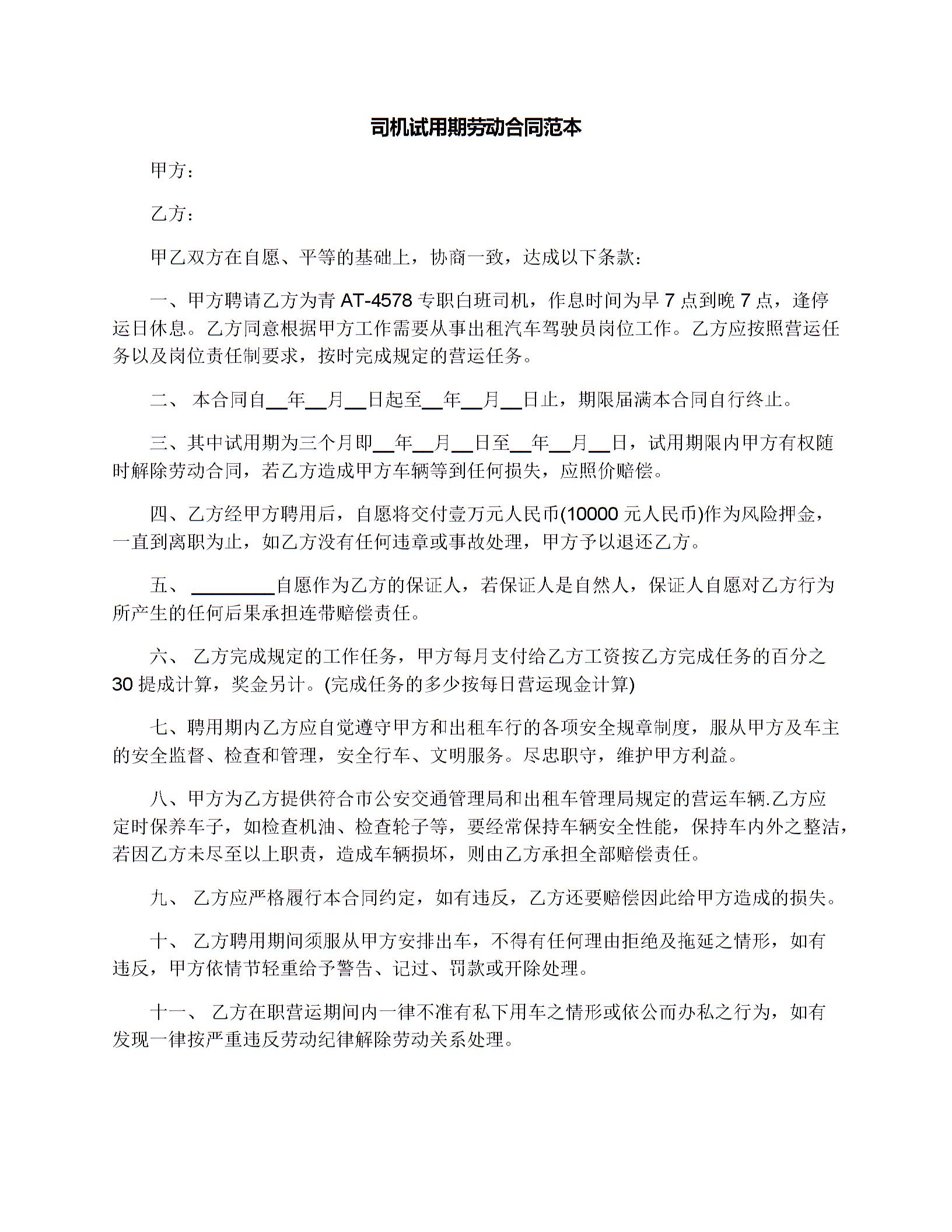 司机试用期劳动合同范本