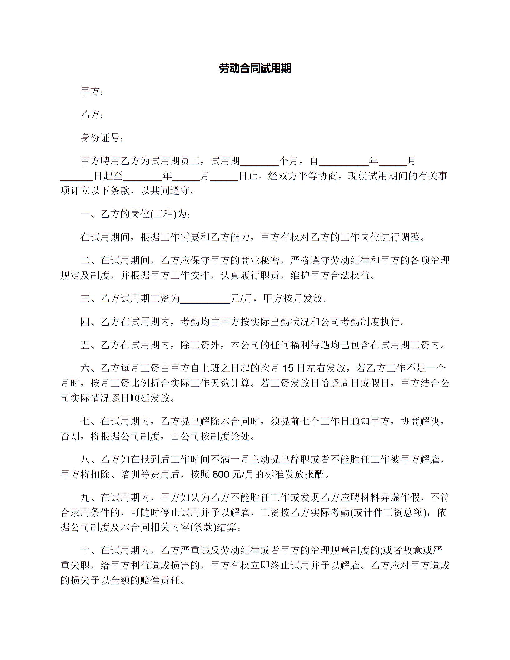 试用期劳动合同协议书