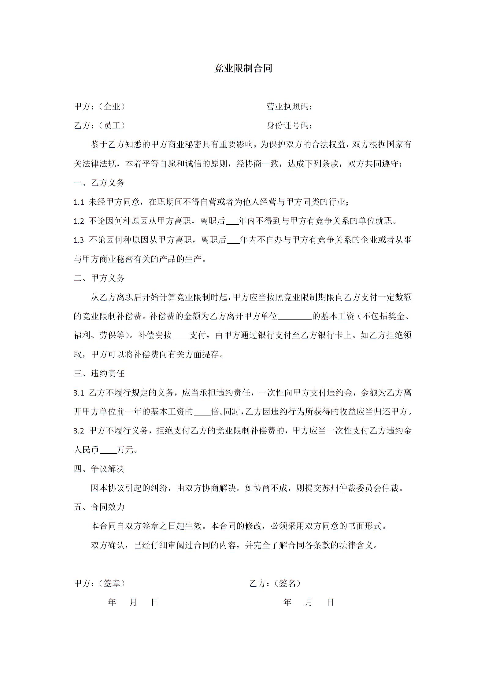 竞业限制合同模板1