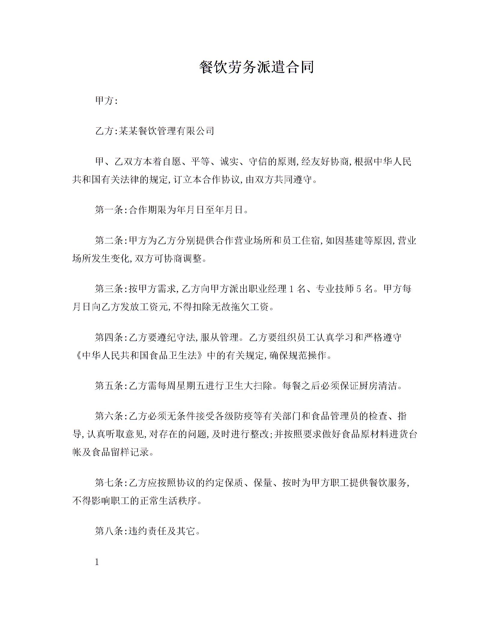餐饮劳务派遣合同
