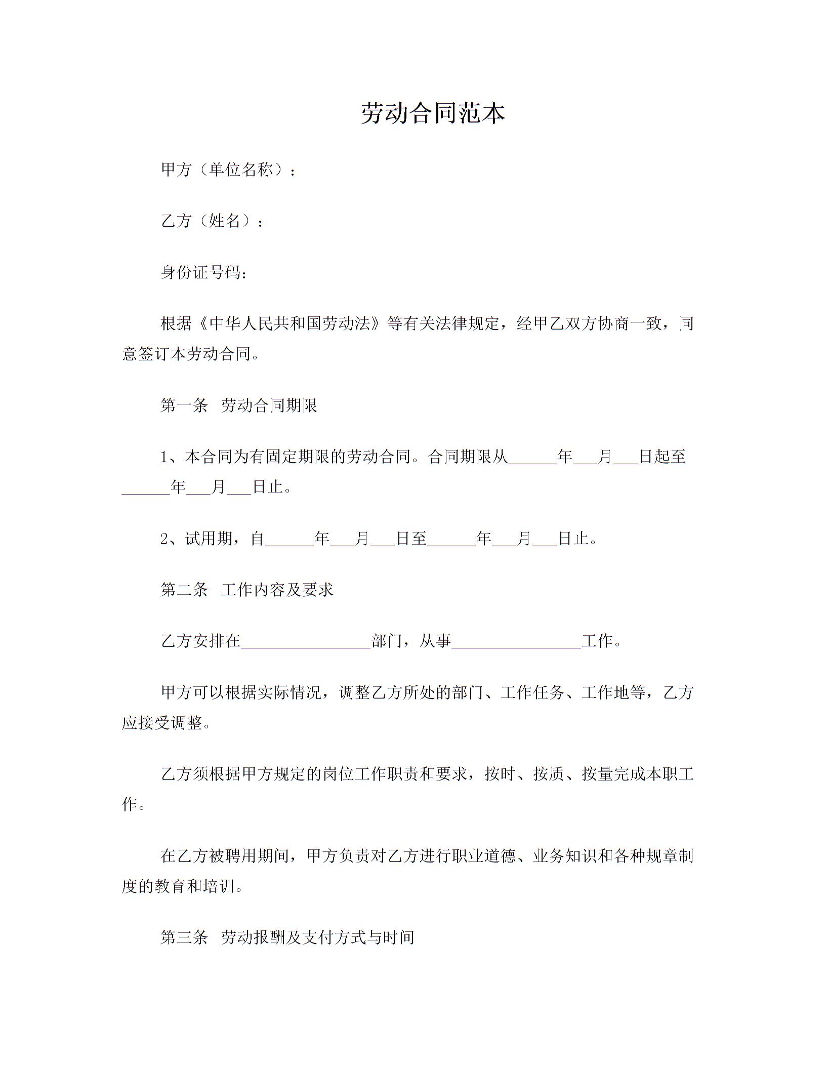 劳动合同范本(含试用期)