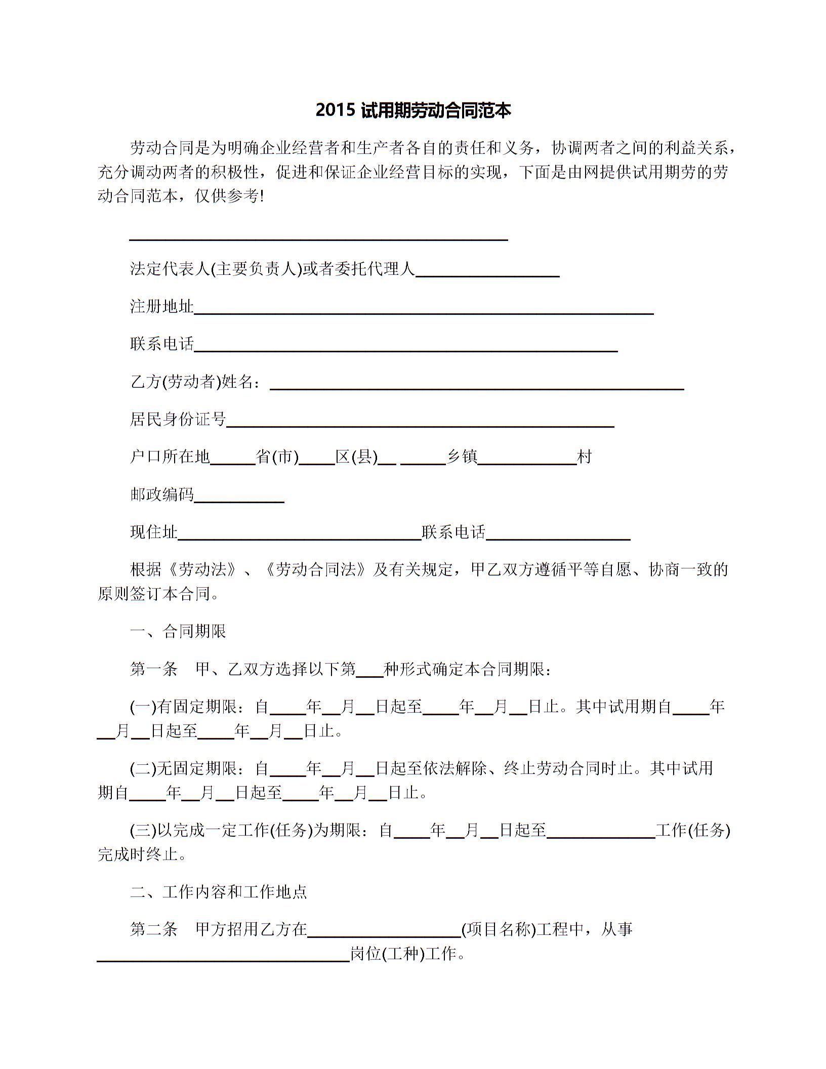 试用期劳动合同范本下载