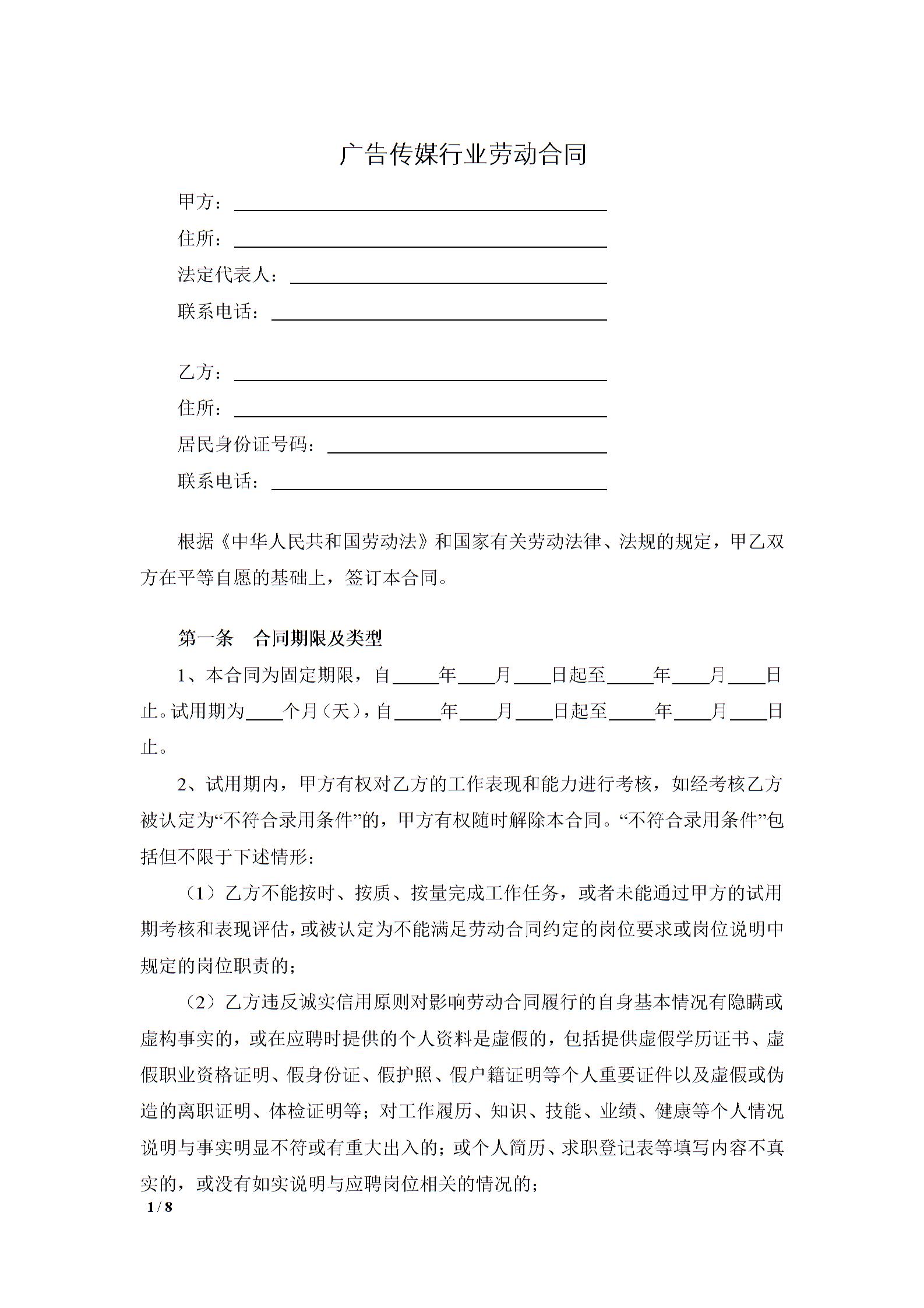 广告传媒行业劳动合同