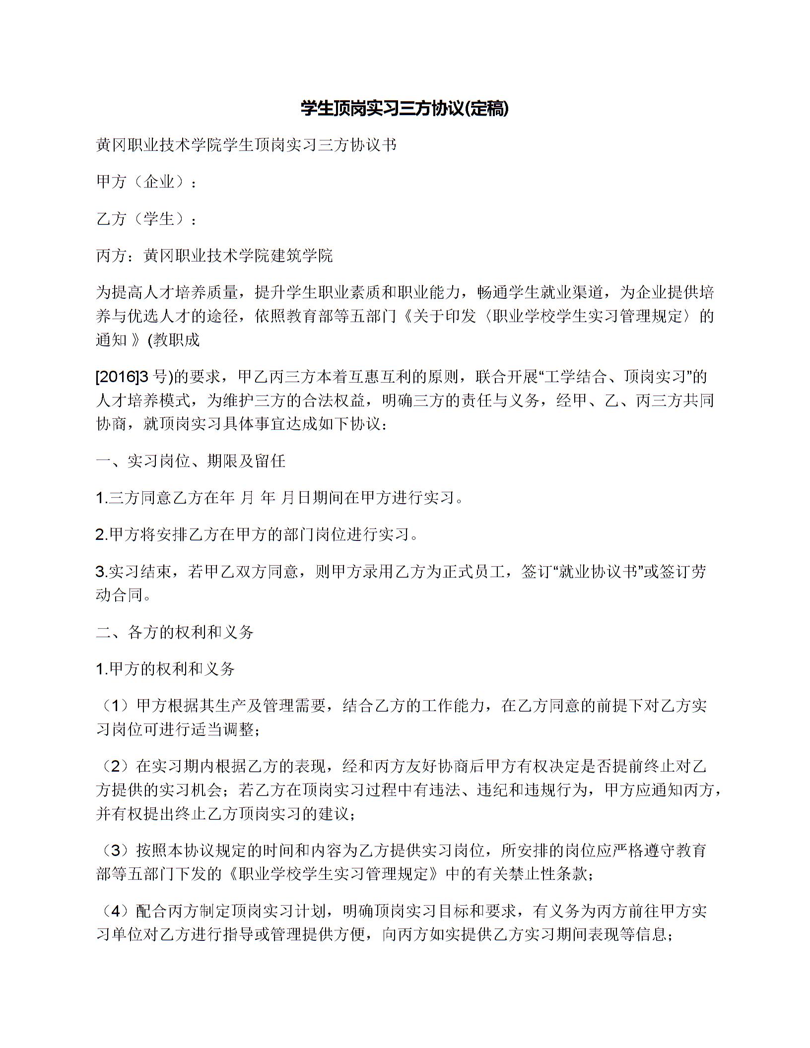 学生顶岗实习三方协议(定稿)