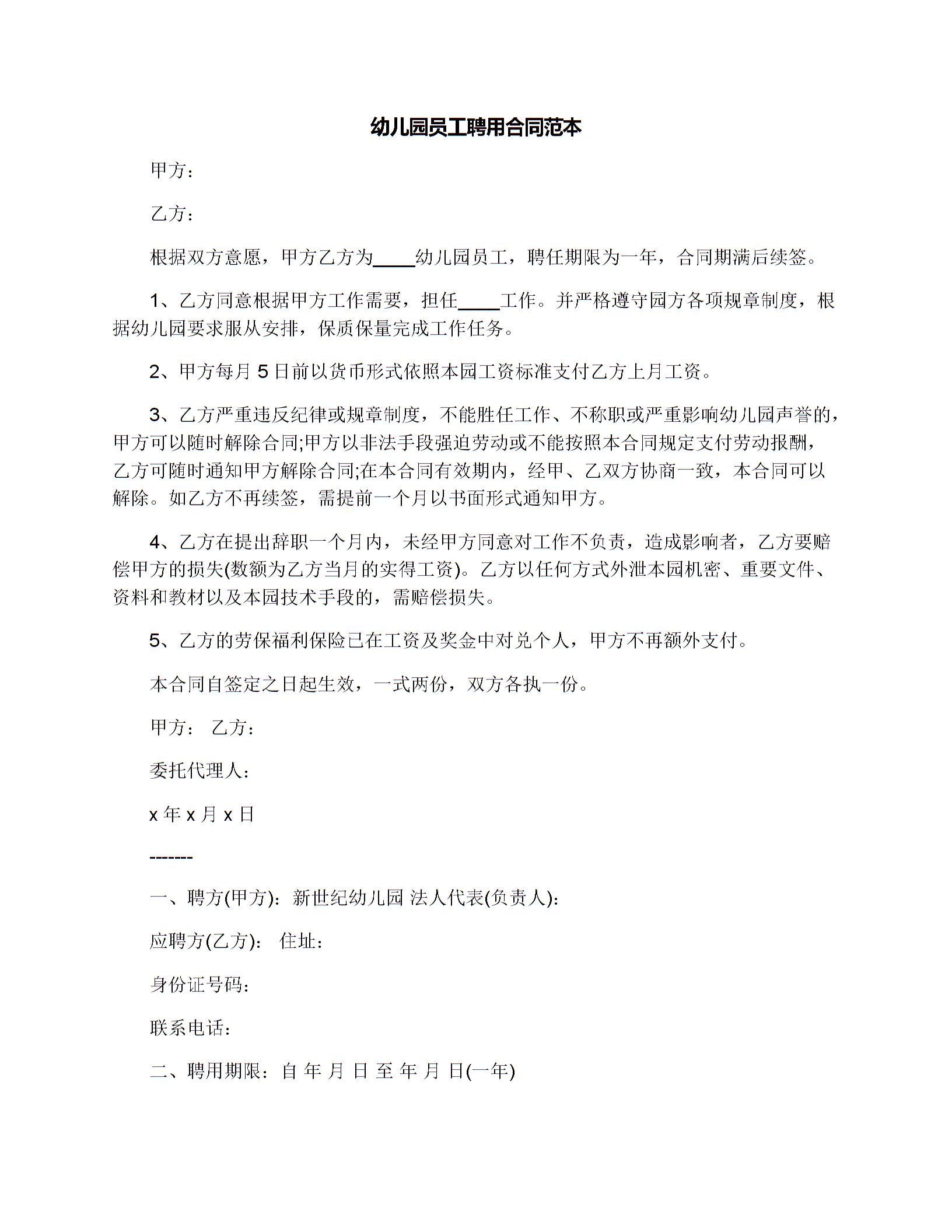 幼儿园员工聘用合同范本