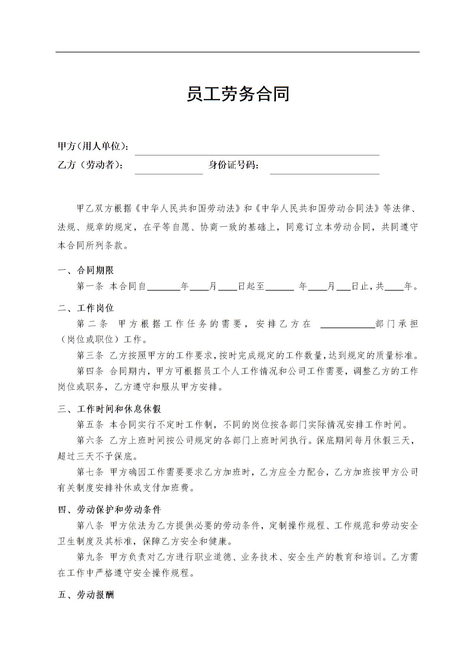 劳务雇佣合同书模板