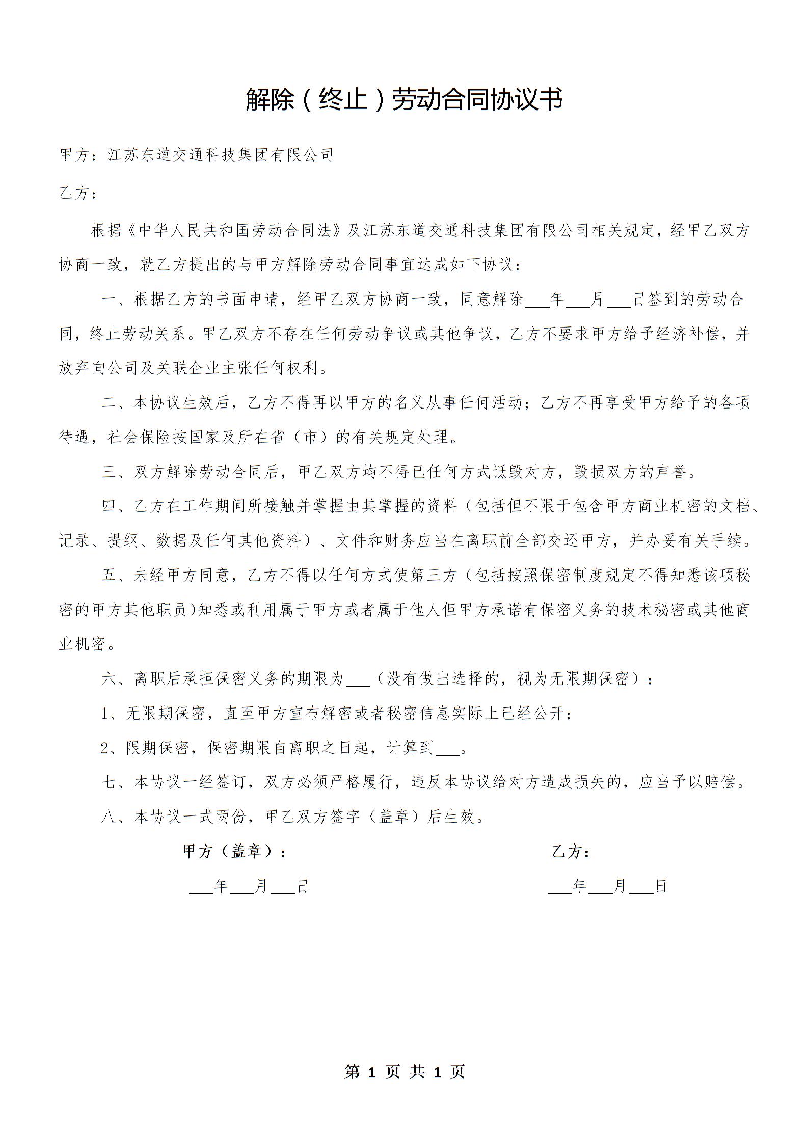 解除(终止)劳动合同协议书