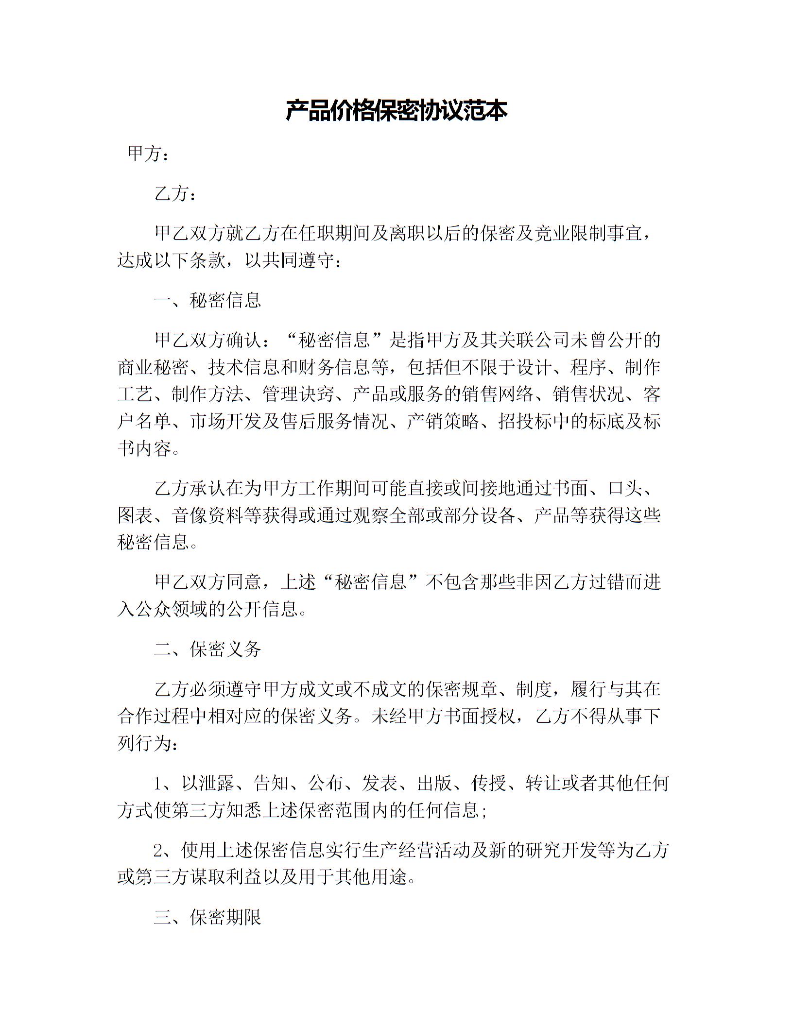 产品价格保密协议范本