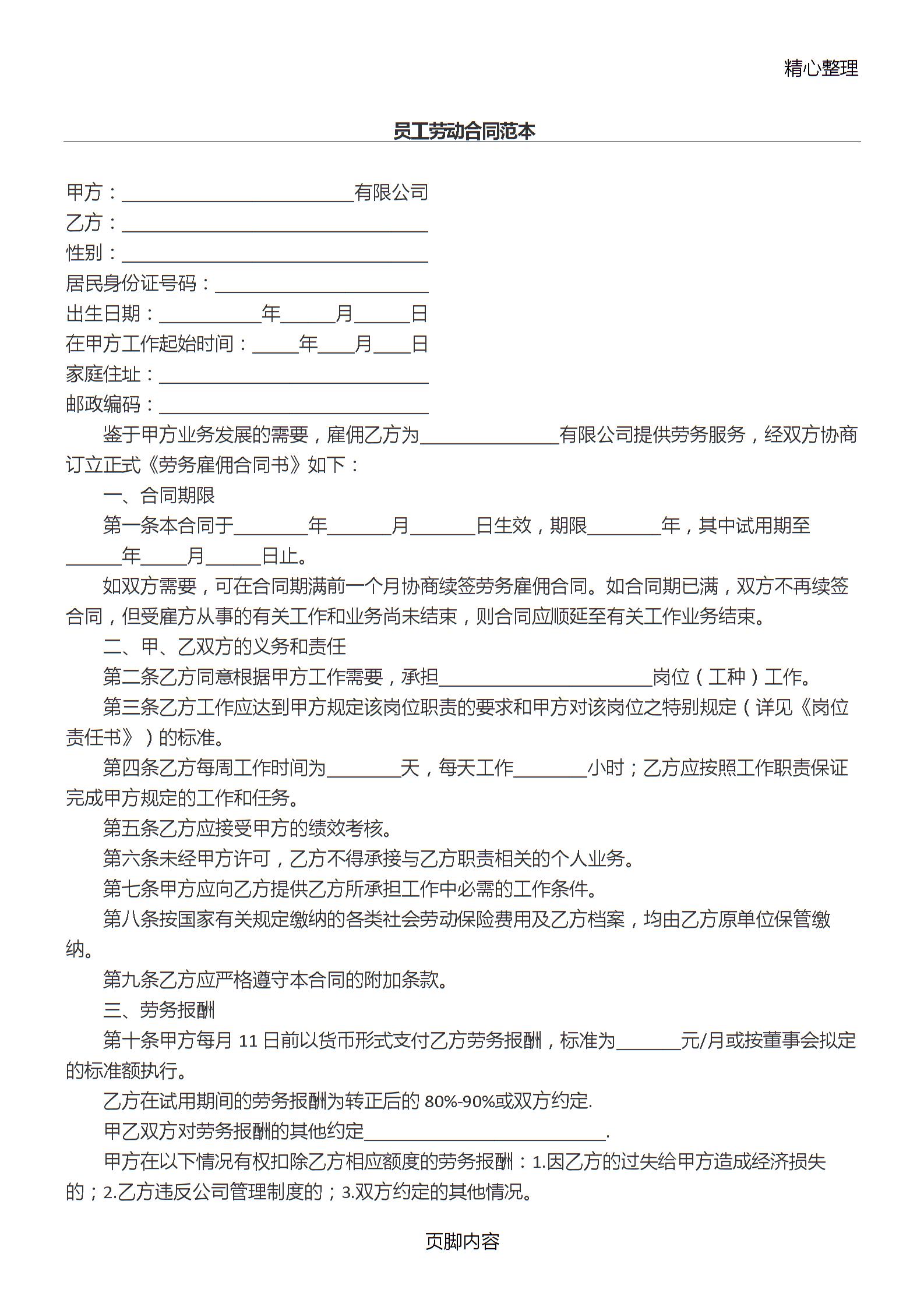 员工劳动合同协议合同书范本