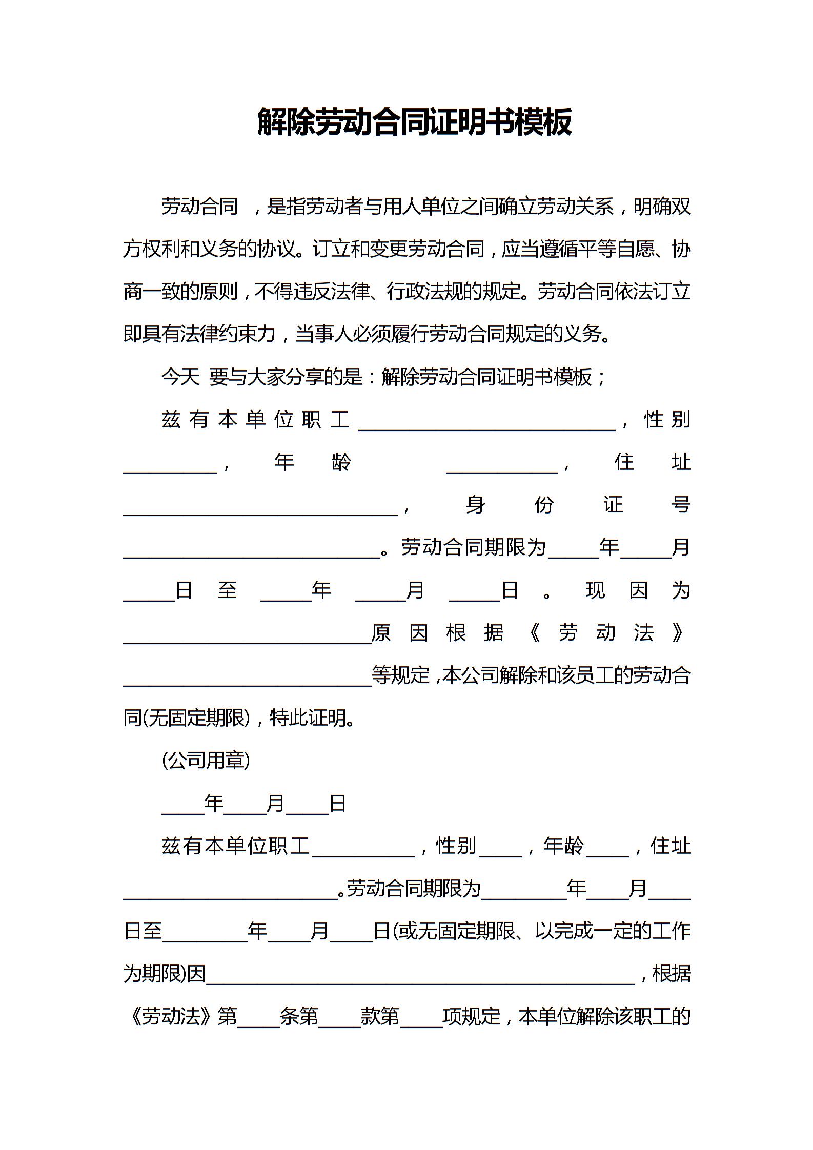 解除劳动合同证明书模板