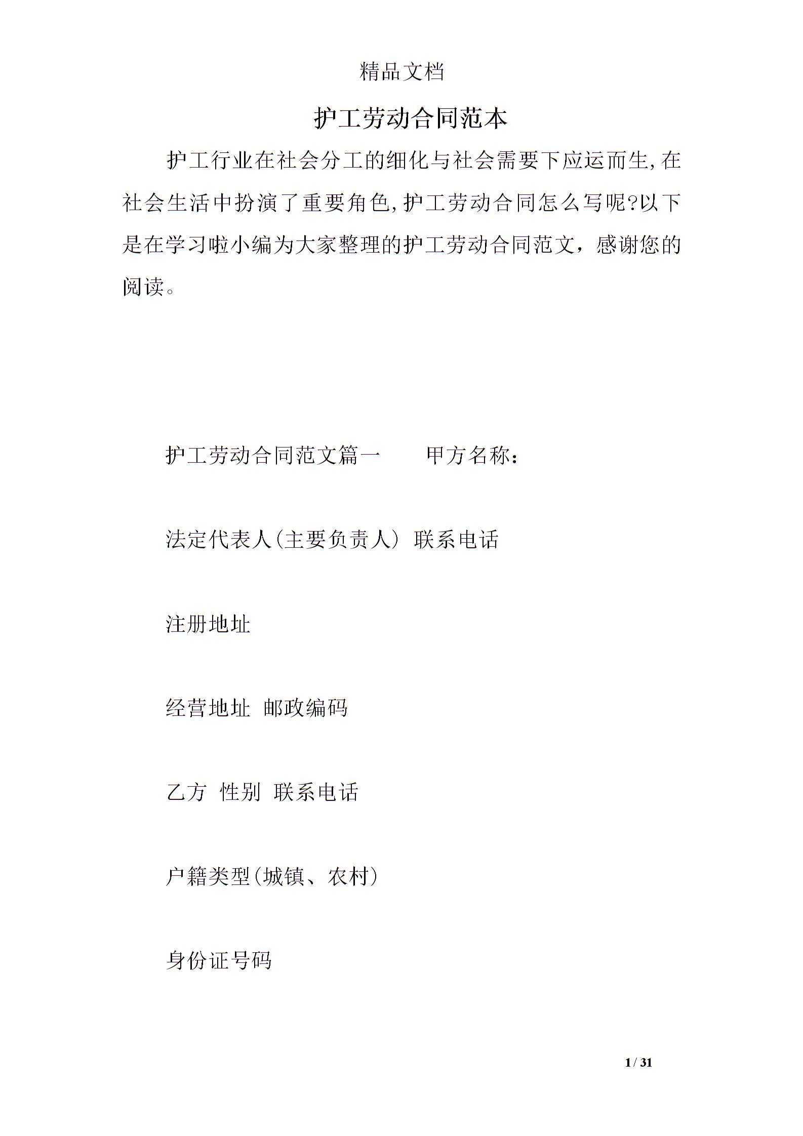 护工劳动合同范本