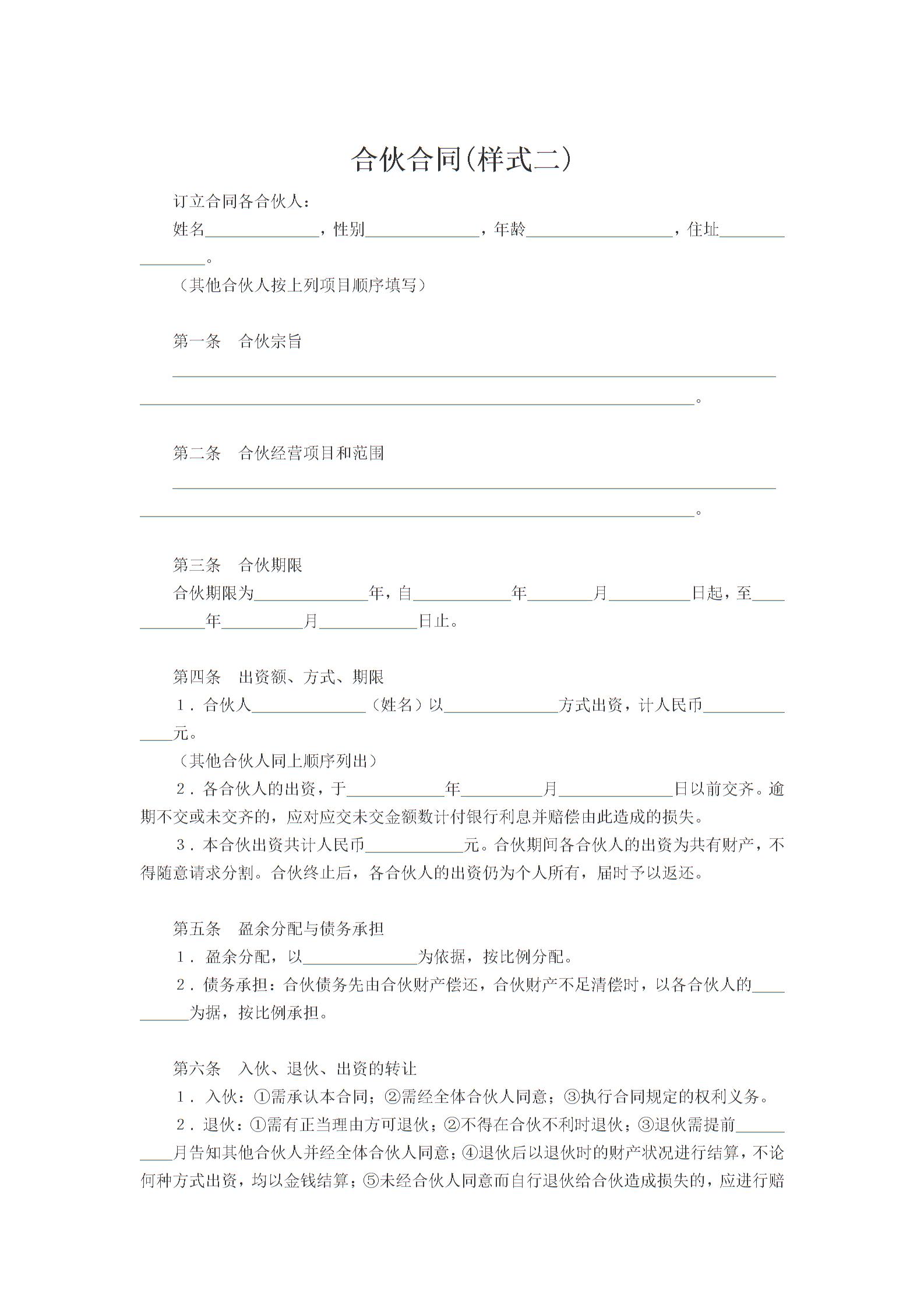 合伙合同(样式二)