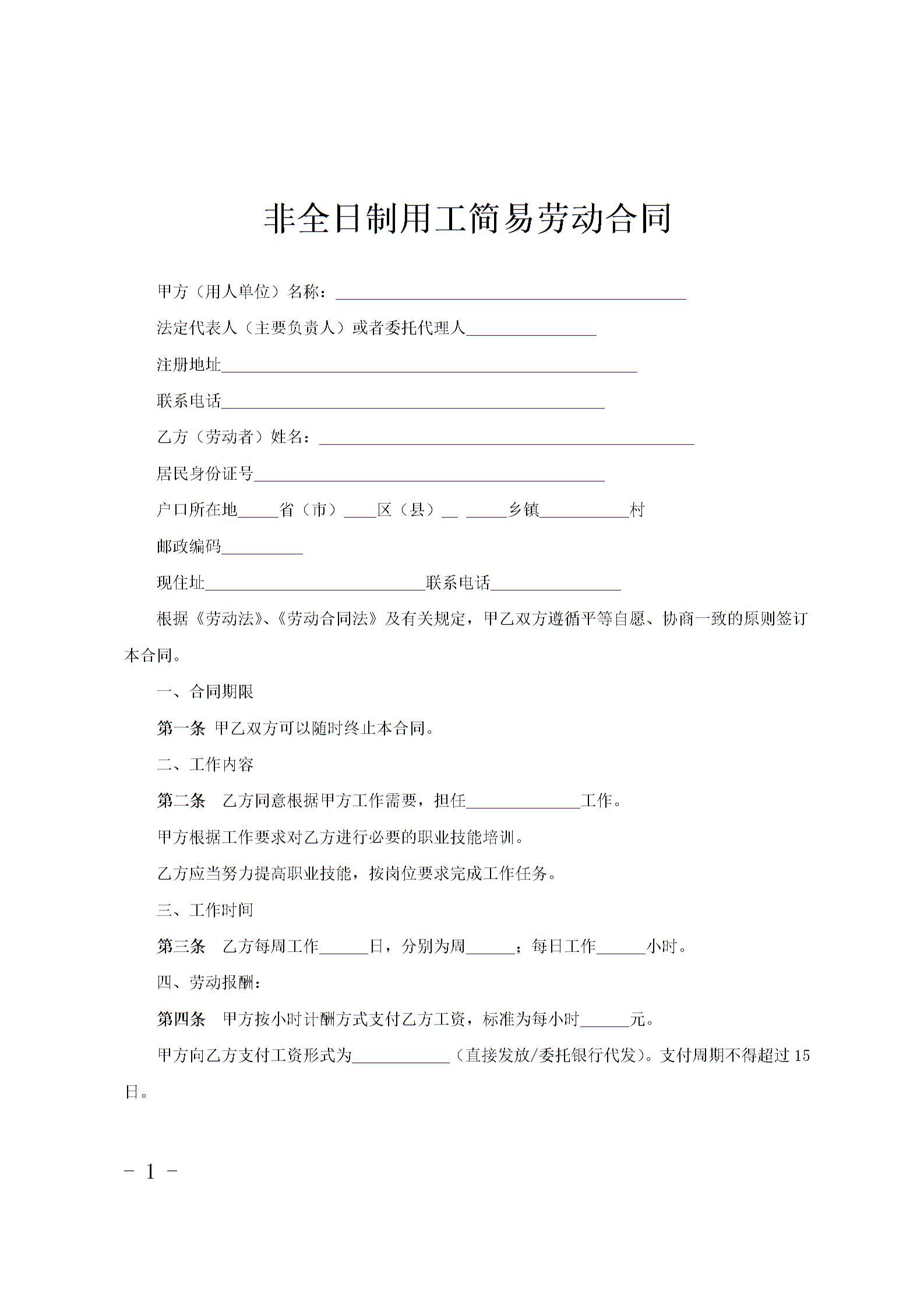 非全日制用工简易劳动合同范文