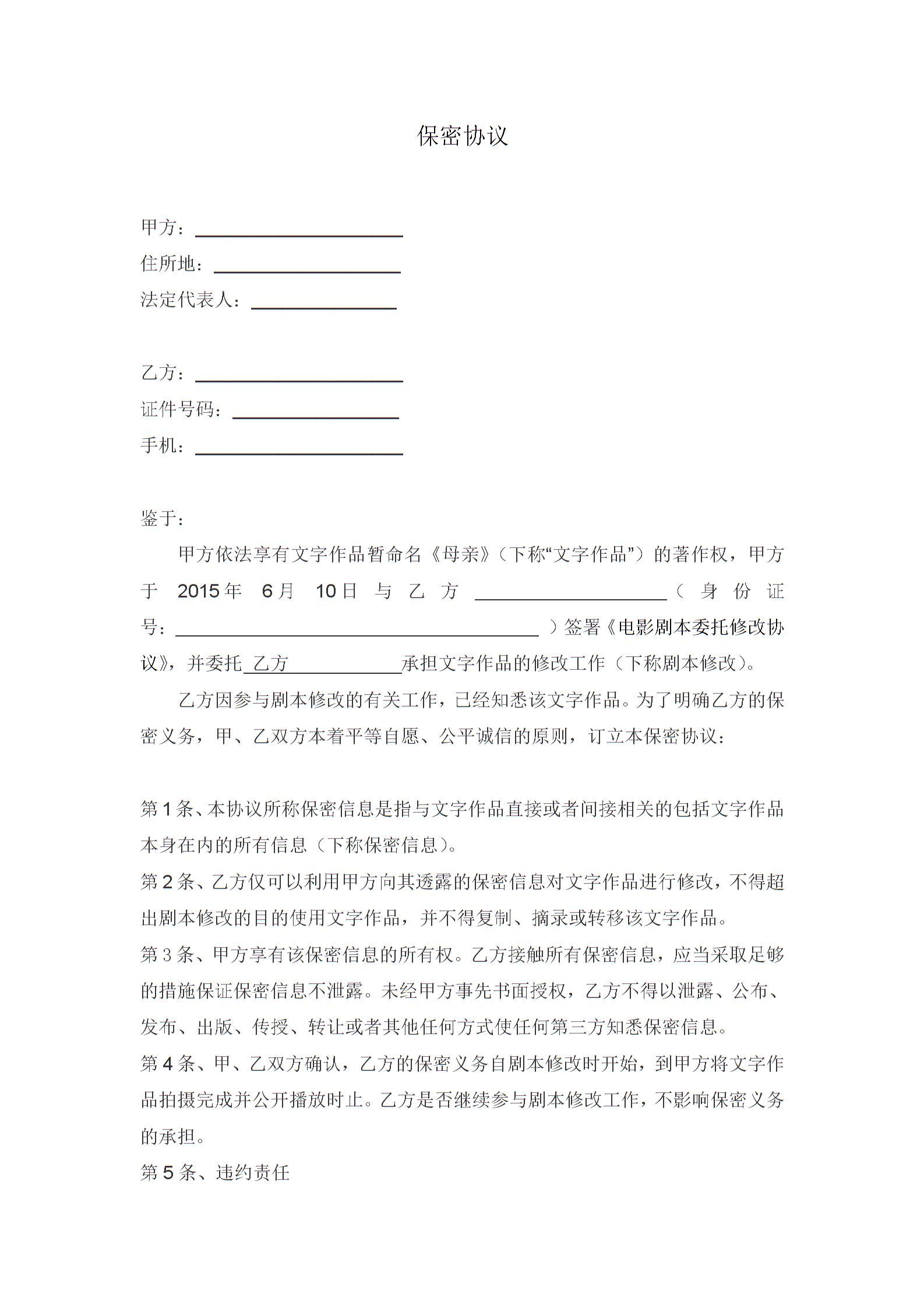 编剧保密协议样本
