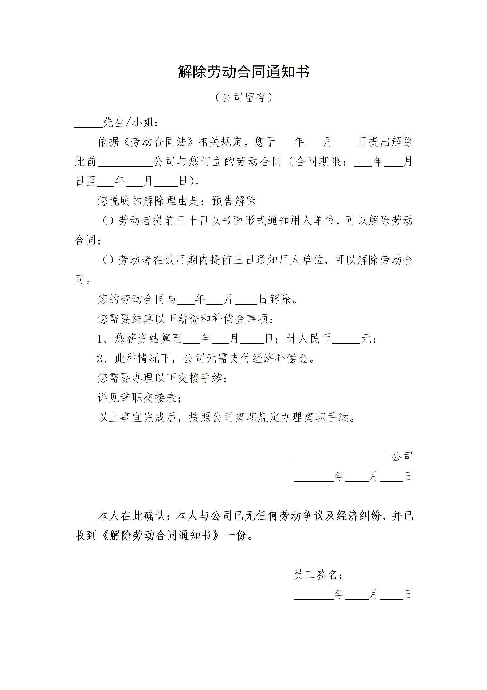 解除劳动合同通知书(员工提前辞职)