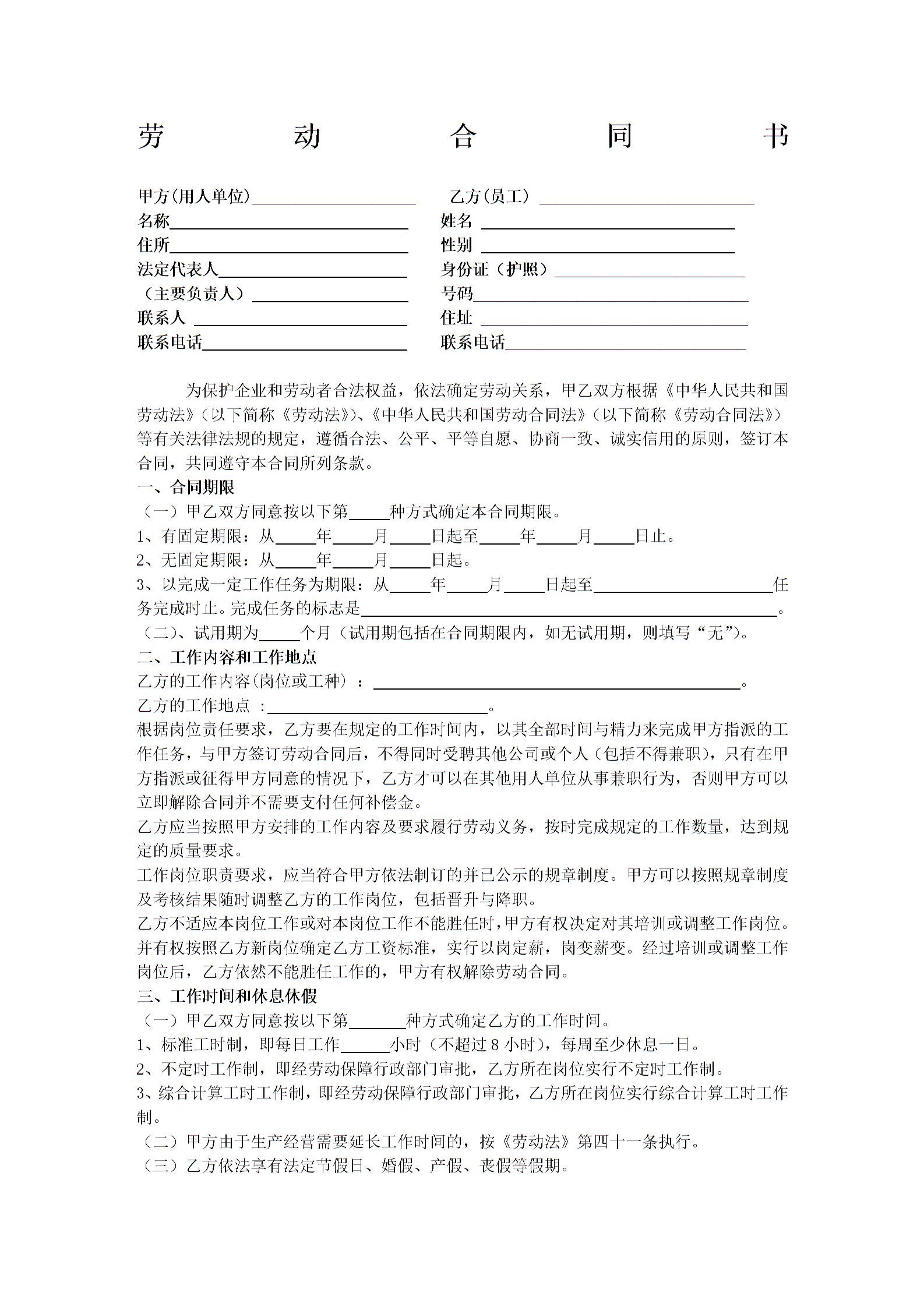 试用期劳动合同范本下载