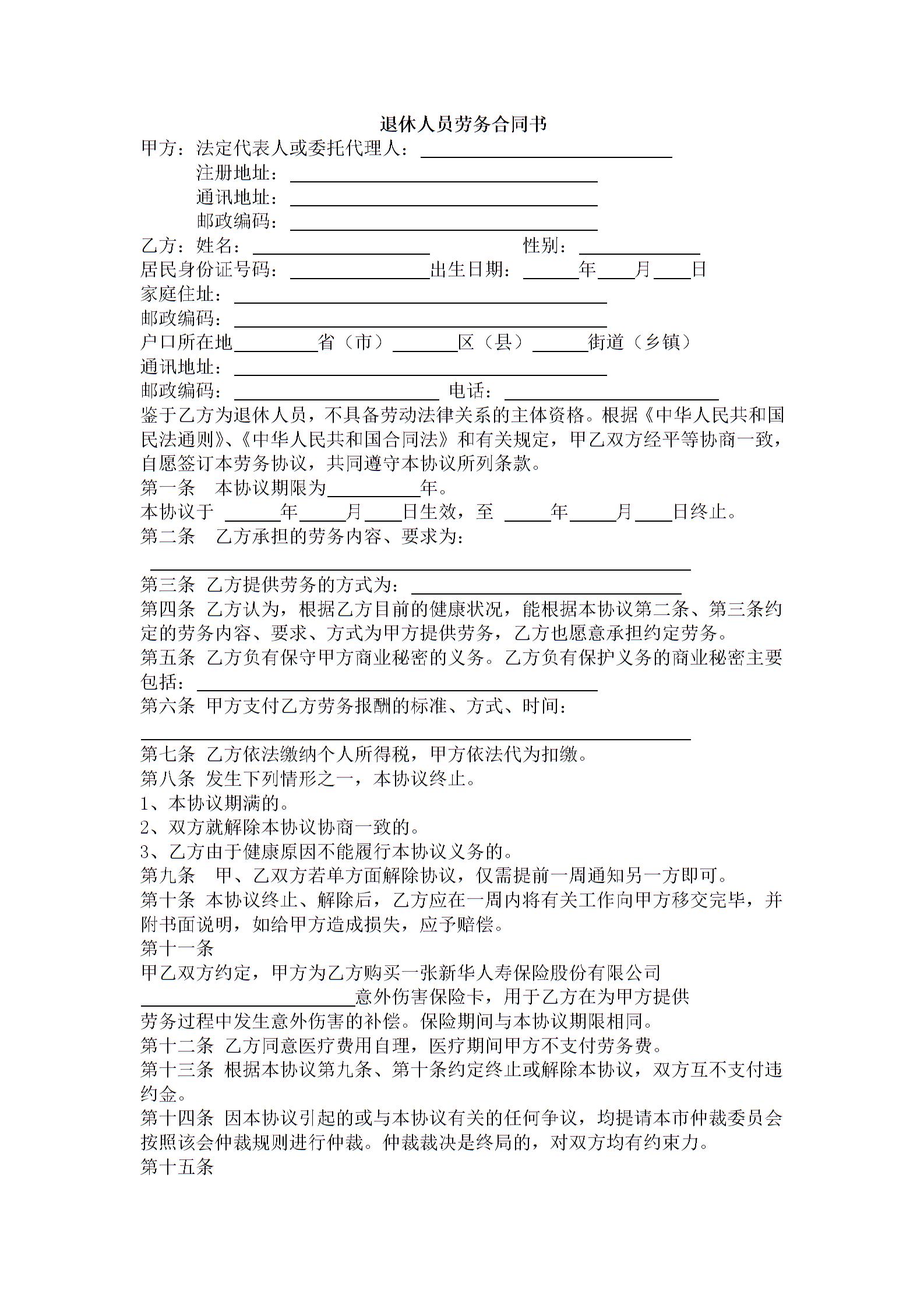退休人员劳务合同