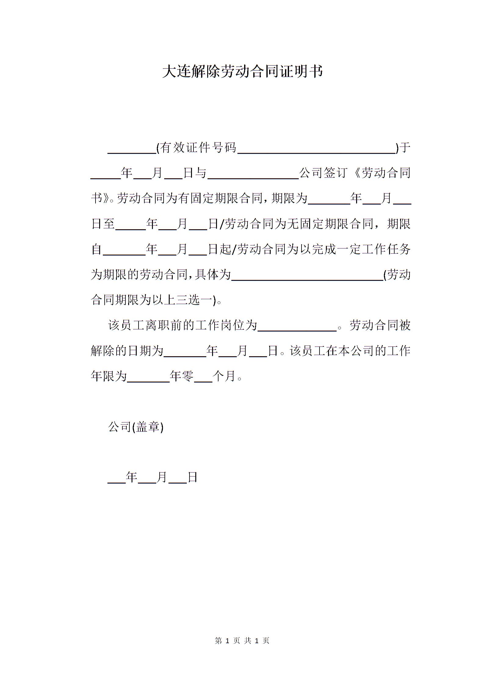 大连解除劳动合同证明书