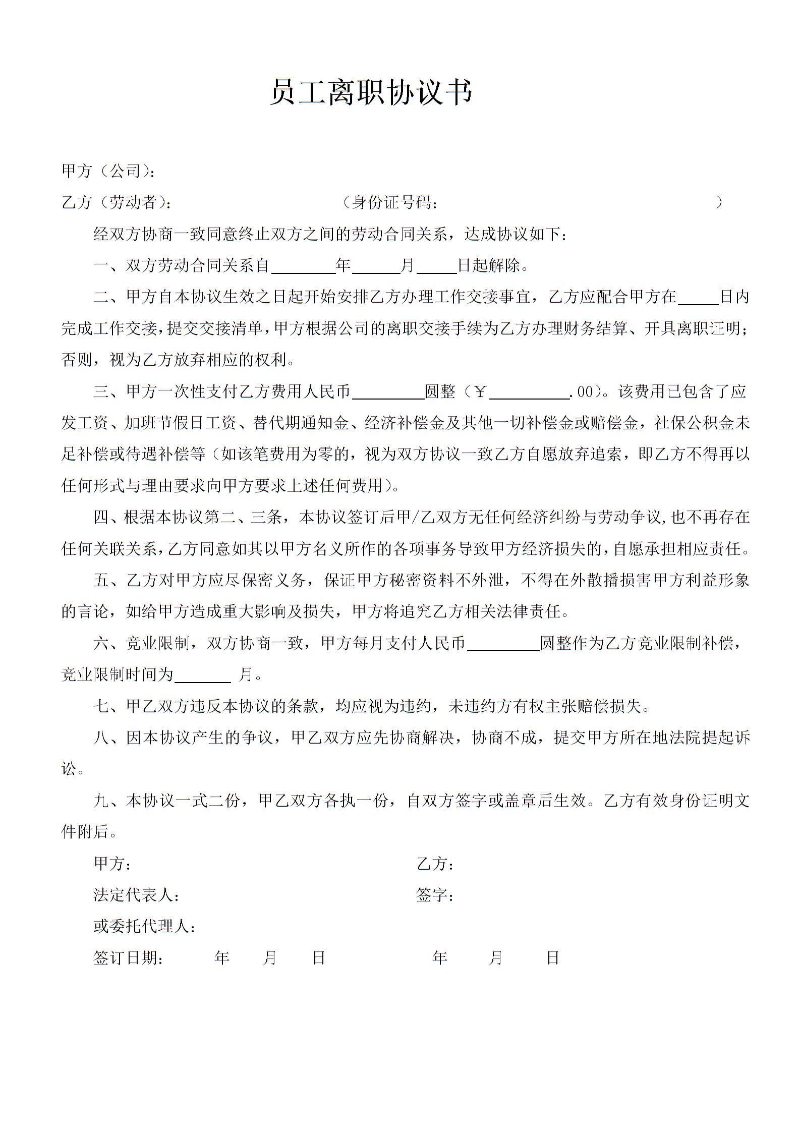 员工离职协议书模板